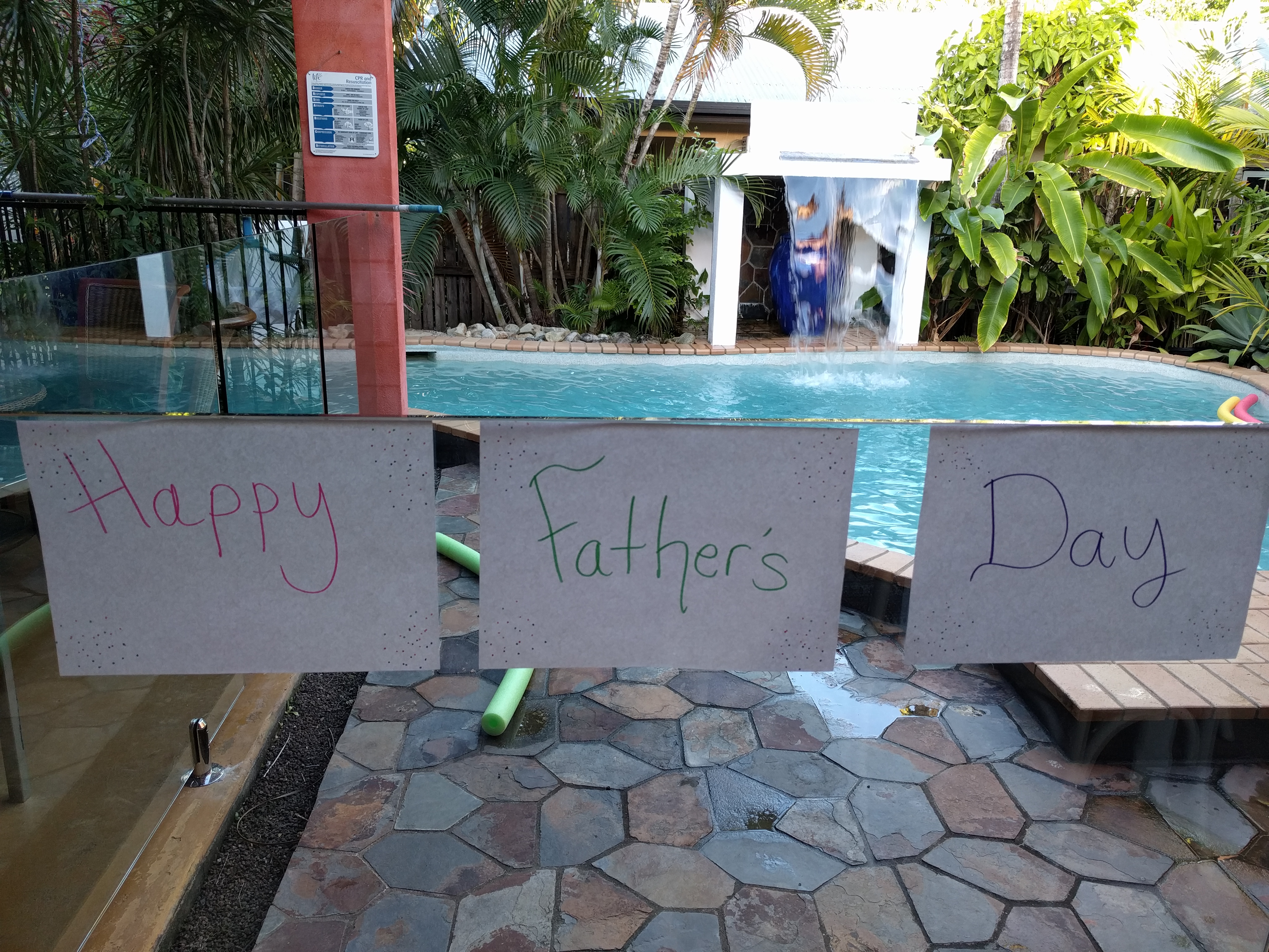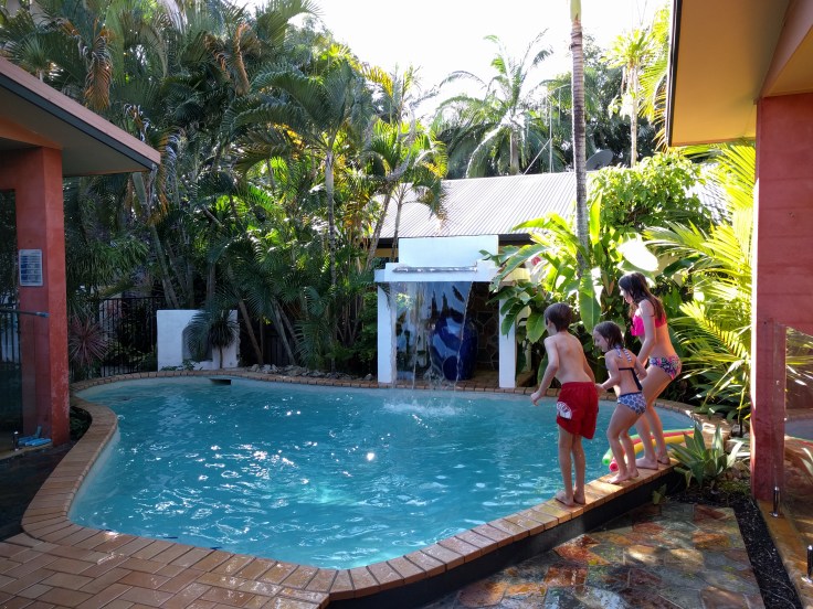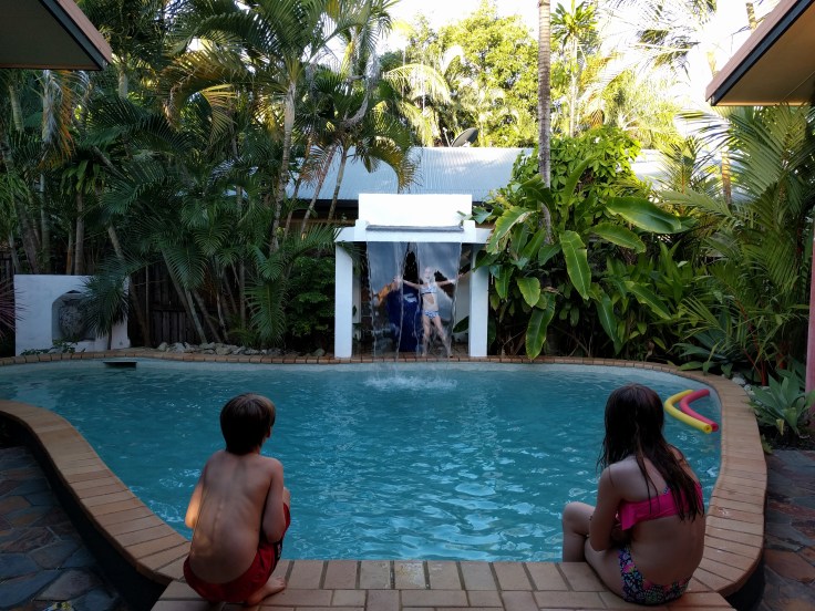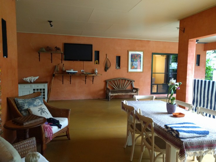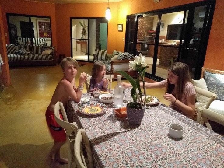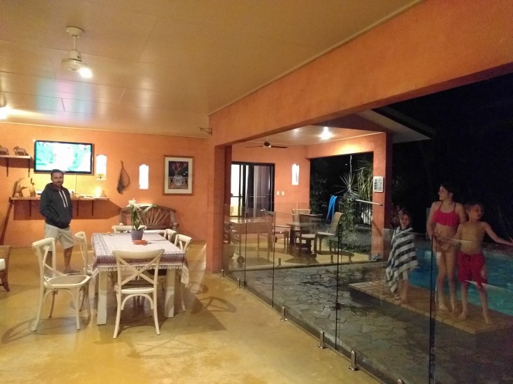 WEDNESDAY We arrived and settled in. The house is so beautiful…the verandah and pool and gardens are nice. We could pick fruit from the trees. It is a very comfortable house which we needed since 3 of us were sick. The kids enjoyed the pool. We got some groceries and relaxed.