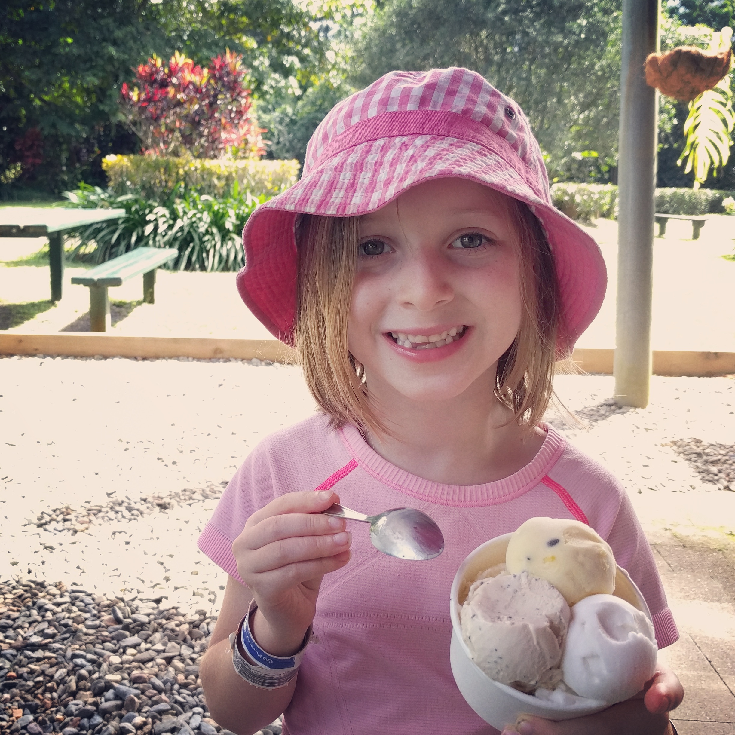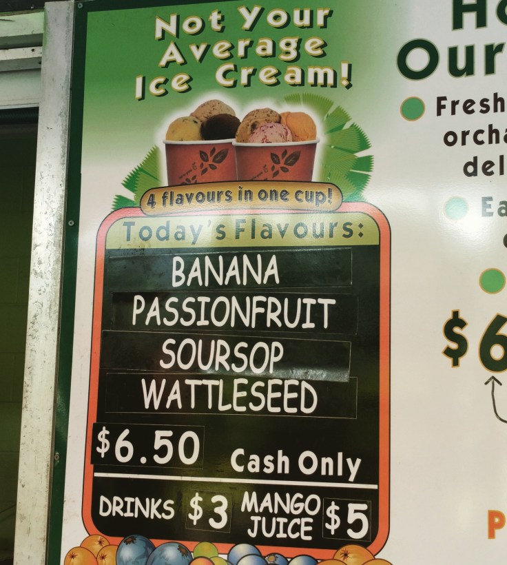 Next, we continued north. The roads were narrow, windy and surrounded by the rainforest. We stopped at Daintree Ice Cream Co. This was the most beautiful place I have ever eaten ice cream. It’s a fruit orchard and they make the ice cream with their own fruit. You don’t order a flavor. You just get a cup with 4 scoops. Whatever flavors they have. Our 4 flavors were: banana, passion fruit, sour sop and wattleseed. My favorite was wattleseed. We spent some time just walking around the property because it had pretty plants and trees. The kids took some photos. It started to get hot and sunny. I can’t believe this is winter.