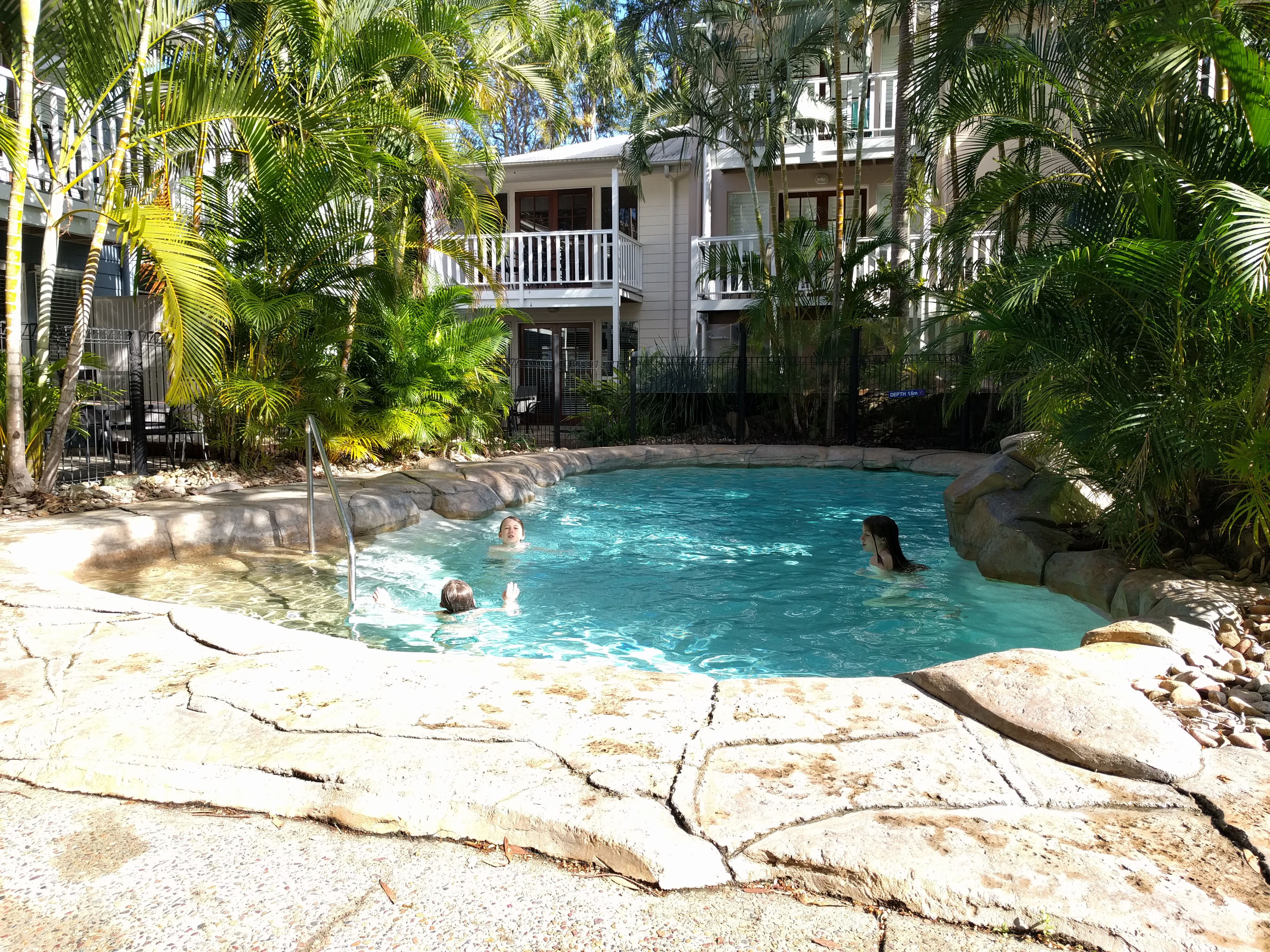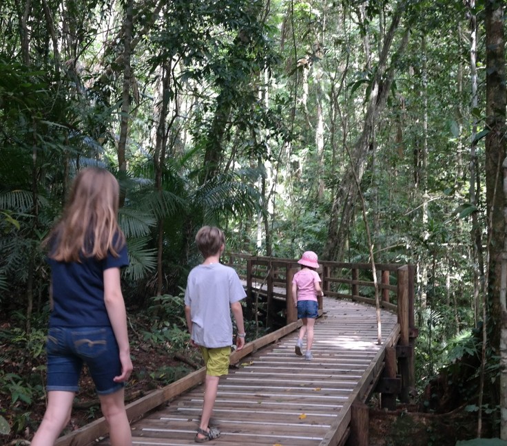 We arrived pretty late on Friday night. It was too late to even get groceries. Luckily, we brought a little food from Byron Bay. We unpacked the car and headed to bed.  We were staying at another Airbnb, but it was more of an aparment/condo type of place. It was in a resort type of complex, but our unit was indpendently owned and managed.  There were 2 pools and a hot tub and a grill in the middle and then all the units around it. We were in a bottom unit that faced the pool. It was pretty quiet (except the birds.) The floor plan here actually reminded me of our house in Denver. Mae and Luke shared a bedroom and Elle had her own.  There were 3 bathrooms and laundry. It was very clean and I felt very comfortable in this house. The pool was super warm and we were almost always the only ones using it. The kids swam a lot.  The bush turkeys were everywhere and we finally saw them fly. More on the birds later…