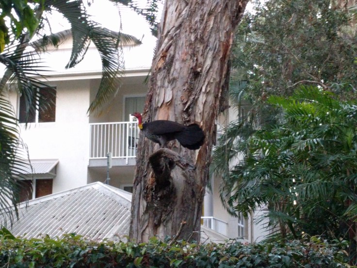 On the first night, Wes was grilling by the pool while the kids swam. I ran across the street to see the sunset. By the way, it is still winter so the sun sets sooooooo early.  Like 5pm! In June. So weird. The days are going to feel so long when we get back to USA. The sunset over the river was stunning. But that wasn’t the main event of the night. THE BIRDS! I can’t even describe it. I brought Elle back to see it the next night. I tried to video it, but it didn’t really capture the craziness. Hundreds and hundreds of birds came flying by and sat in trees and were so loud. I couldn’t hear Elle talk next to me that’s how loud they were. And they just kept swooping over us. Lorikeets and cockatoos were the main attractions. It was a bird party. The first night I had to stop and ask someone what was happening. Everyone was acting like this was normal. The lady I asked told me this happens every night at sunset and every morning. We could hear it a bit from our house, but nothing too disturbing.  Bush turkeys are everywhere. At the pool, on the sidewalks, on the beach….they are funny birds.