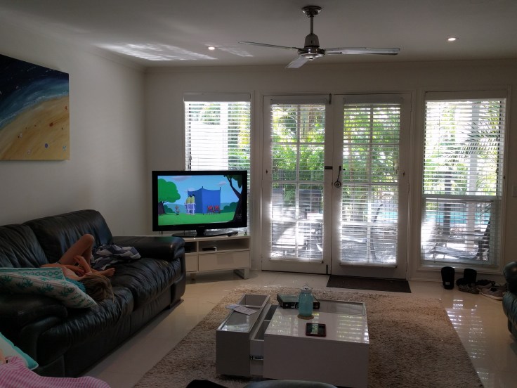 This house has such a great set up. We were outside all of the time.  Eat, swim, TV…everything OUTSIDE. You even have to go outside to get to 2 of the bedrooms. Felt amazing. Temperature is very pleasant. Mid 70-80s. I decided to unpack every bag and start over. Try and lighten our load a little. The laundry here is also out on the verandah, so I am all caught up on that. Able to assess what we need for the remainder of our time in Australia. I still don’t drive here and our house is pretty remote. So we have truly hunkered down. Thank goodness the house has a tea kettle and Nespresso machine.