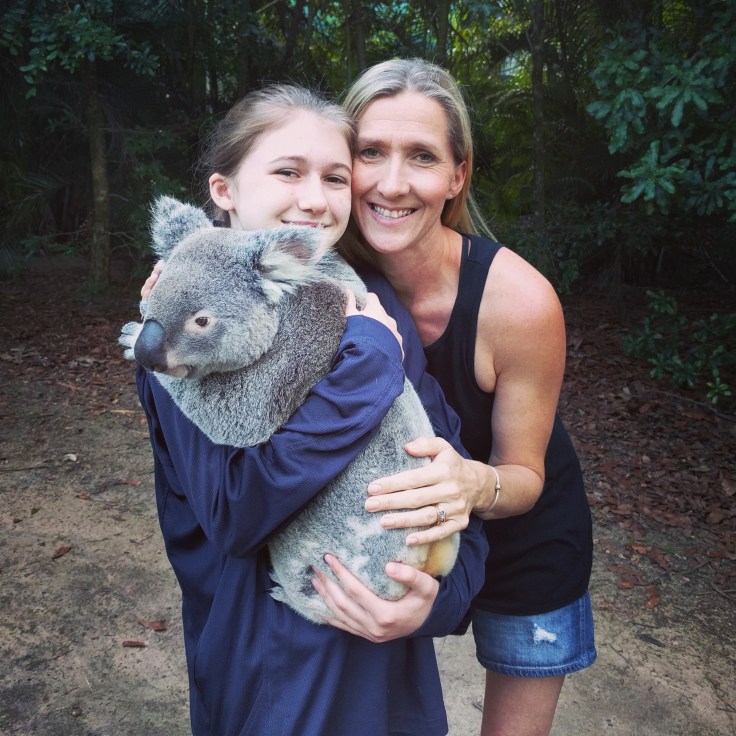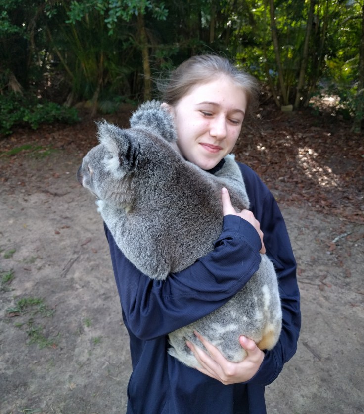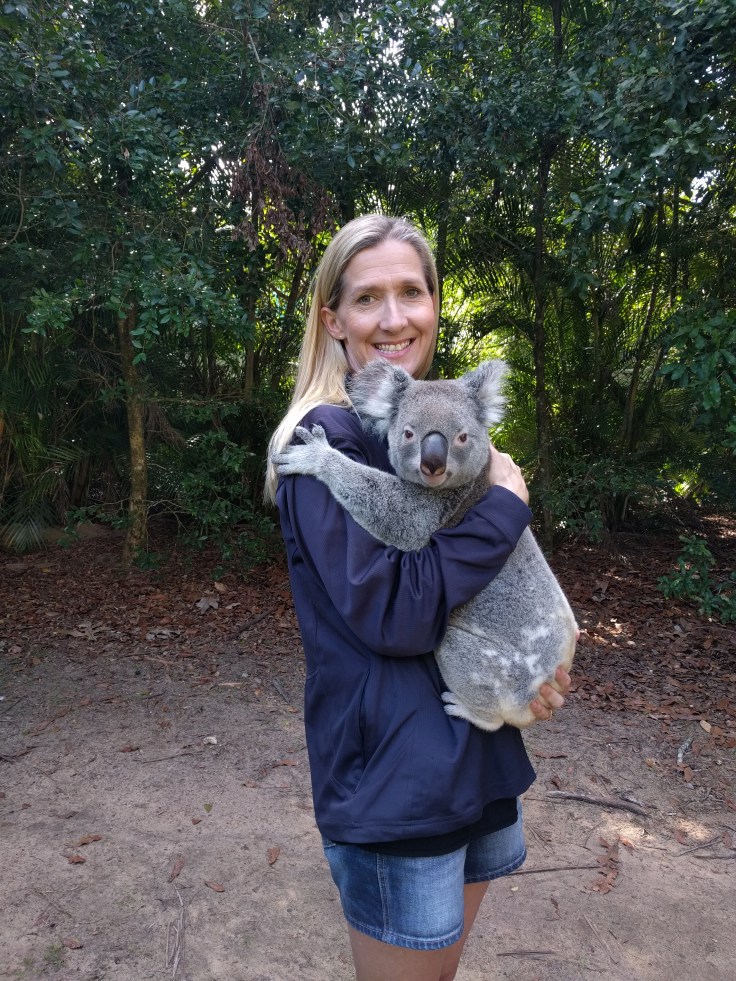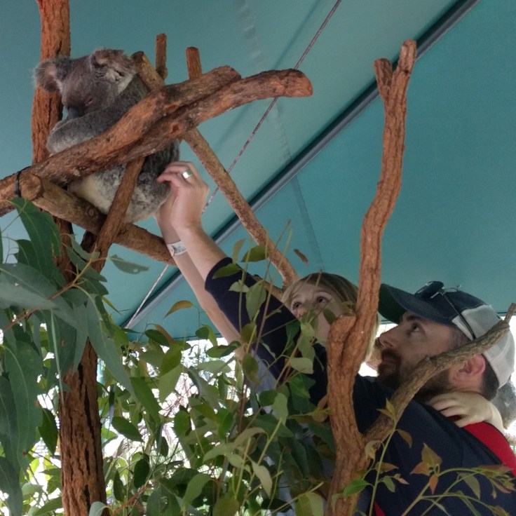 There were two ladies working with us and the koala. There was someone there, also, to take pictures. We got to hold him twice. His name was Nitro. 3 years old. First thing I noticed was his smell. The makes have a strong scent for marking trees. They get smellier the older they get. We smelled like eucyltups for the rest of the day. Elle held him first and then me. After the “formal pictures” were taken by the zoo (we didn’t buy any of them but we have the proofs), we all got a 2nd hold for a little longer and we could then take our own photos. Wes and the kids were not far away. We decided to steal Wes’ jacket because Elle and I had on tank tops and OUCH. His claws just dug into us. It was much better with the jacket for our second hold. He was heavier than I expected. They look like little fluffy balls when you see them in a tree. But Nitro was solid. And we loved him. He seemed to actually have a personality. I read on the website that he became a father recently. I’m so glad we did it. I still have koala scratches 4 days later. We will never forget Nitro. For Elle, this was a dream come true and a mic drop for our Oz travels. She came. She saw. She held a koala.