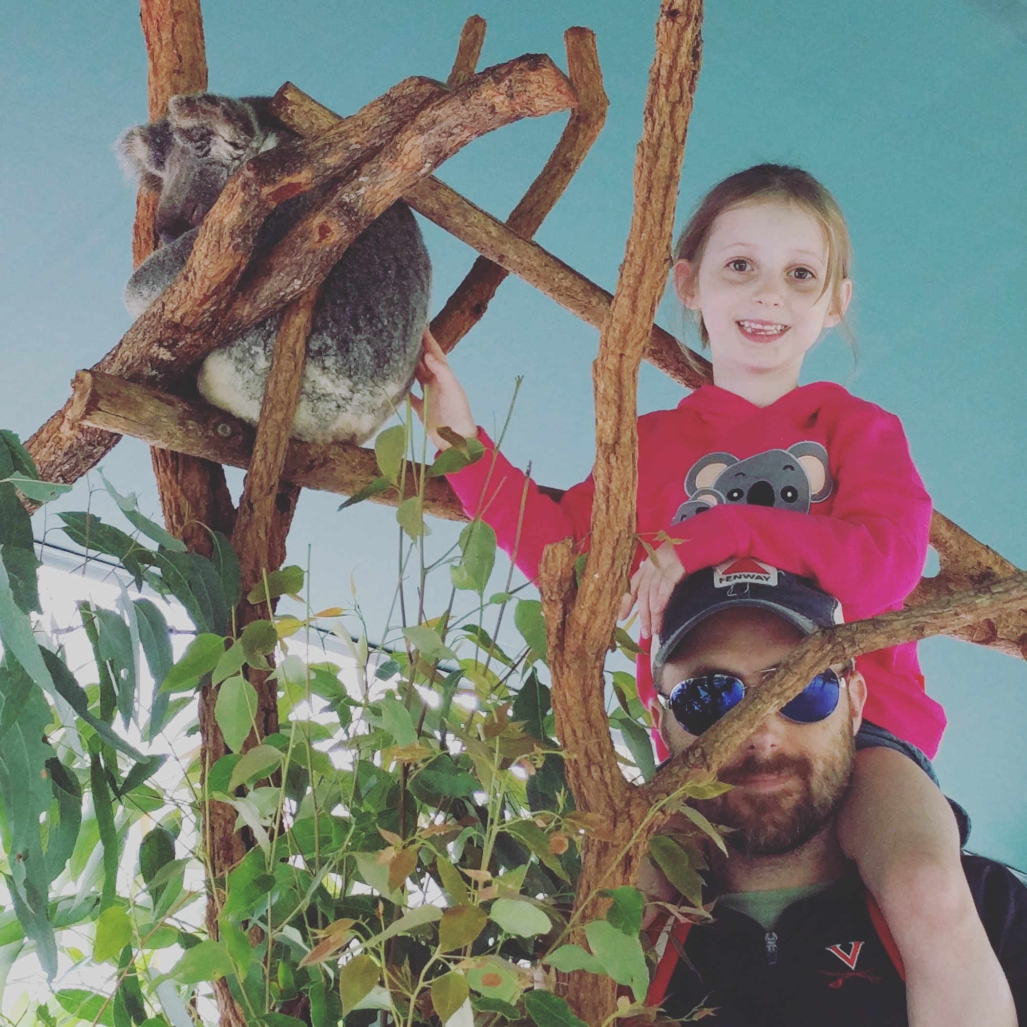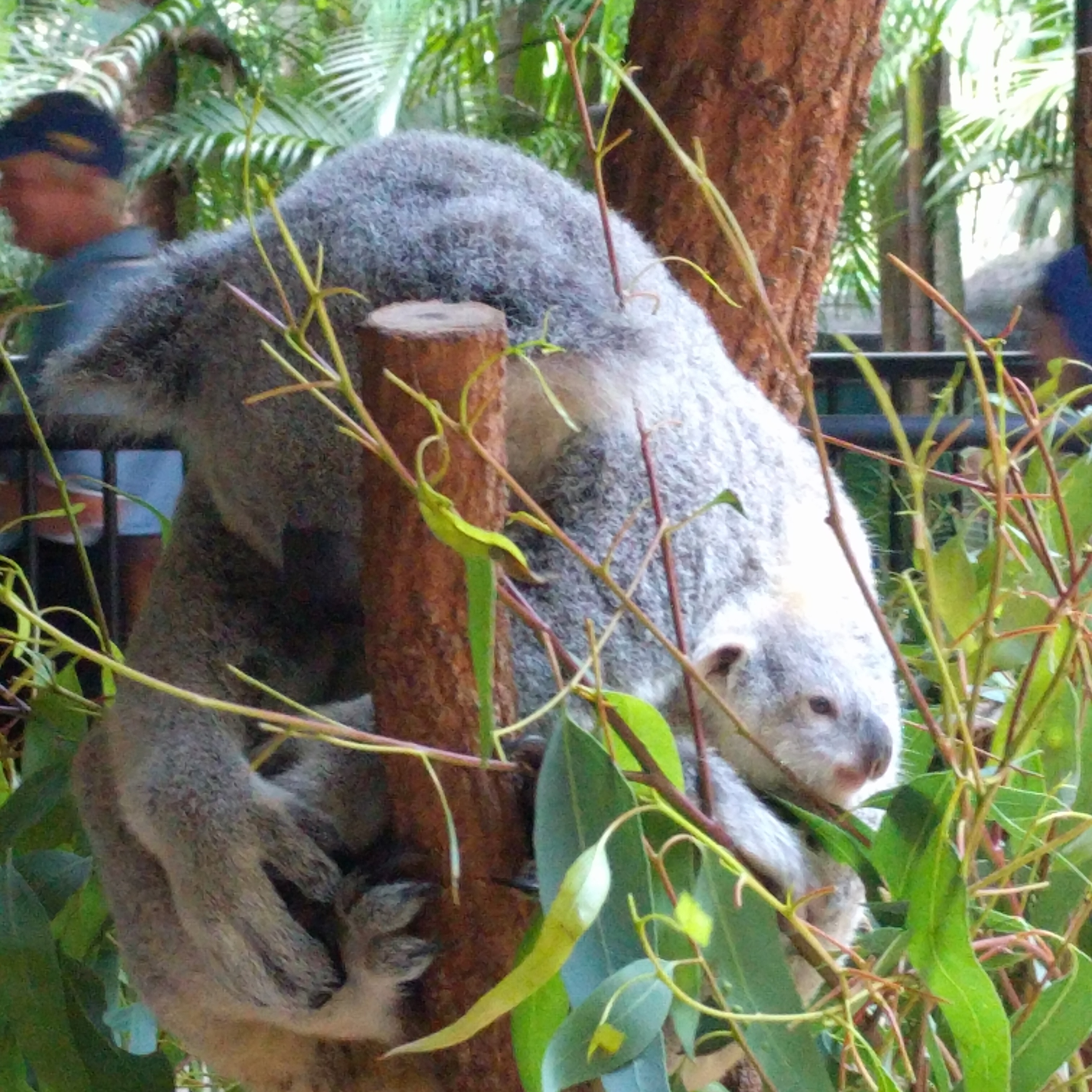 Now for the best part…koalas!!! When in Australia…we hold koalas. Before I talk about the koala cuddles, I have to give a little background. At the zoo in Sydney, we learned that koalas are not social animals and they like to be alone. We also learned that just because something looks cuddly, doesn’t mean they like to be cuddled. It is actually not legal to hold a koala in New South Whales, but it is in Queensland. Because of this, Wes had no interest in holding one. The age limit was 8, so Mae couldn’t do it.  Luke said no because of the claws (good call on his part….OUCH) and Elle was all in. So before we went to the zoo, I signed us both up for the “koala encounter.”  This encounter was for 4 people to spend some time with a koala…..cuddling and taking pics. The good news is that there are koalas all over the zoo. Mae and Luke and Wes were able to pet one. We saw all the mommy koalas hanging out together and even saw a little joey pop his/her head out of a pouch. We saw many workers walk by holding the little guys. They were a big part of the zoo, so we all got to know the koalas better. Elle and I went out back to a field area where they hold the animal encounters. It was quiet and we were with a nice, young couple from the UK.