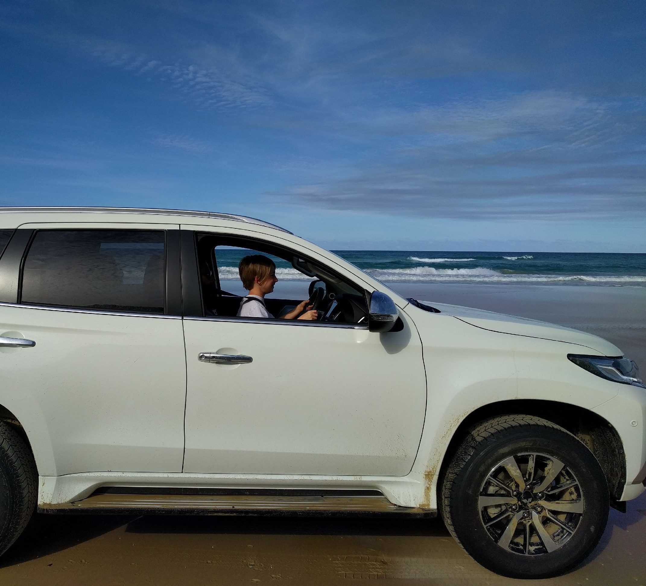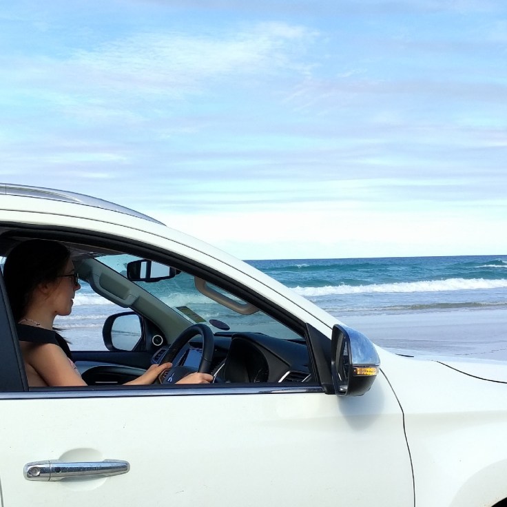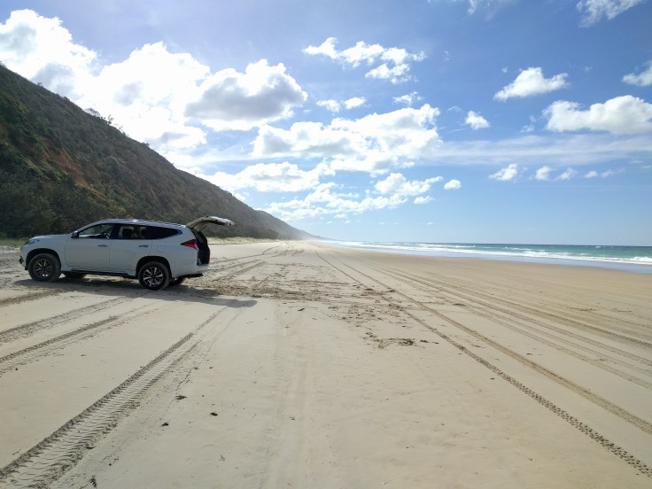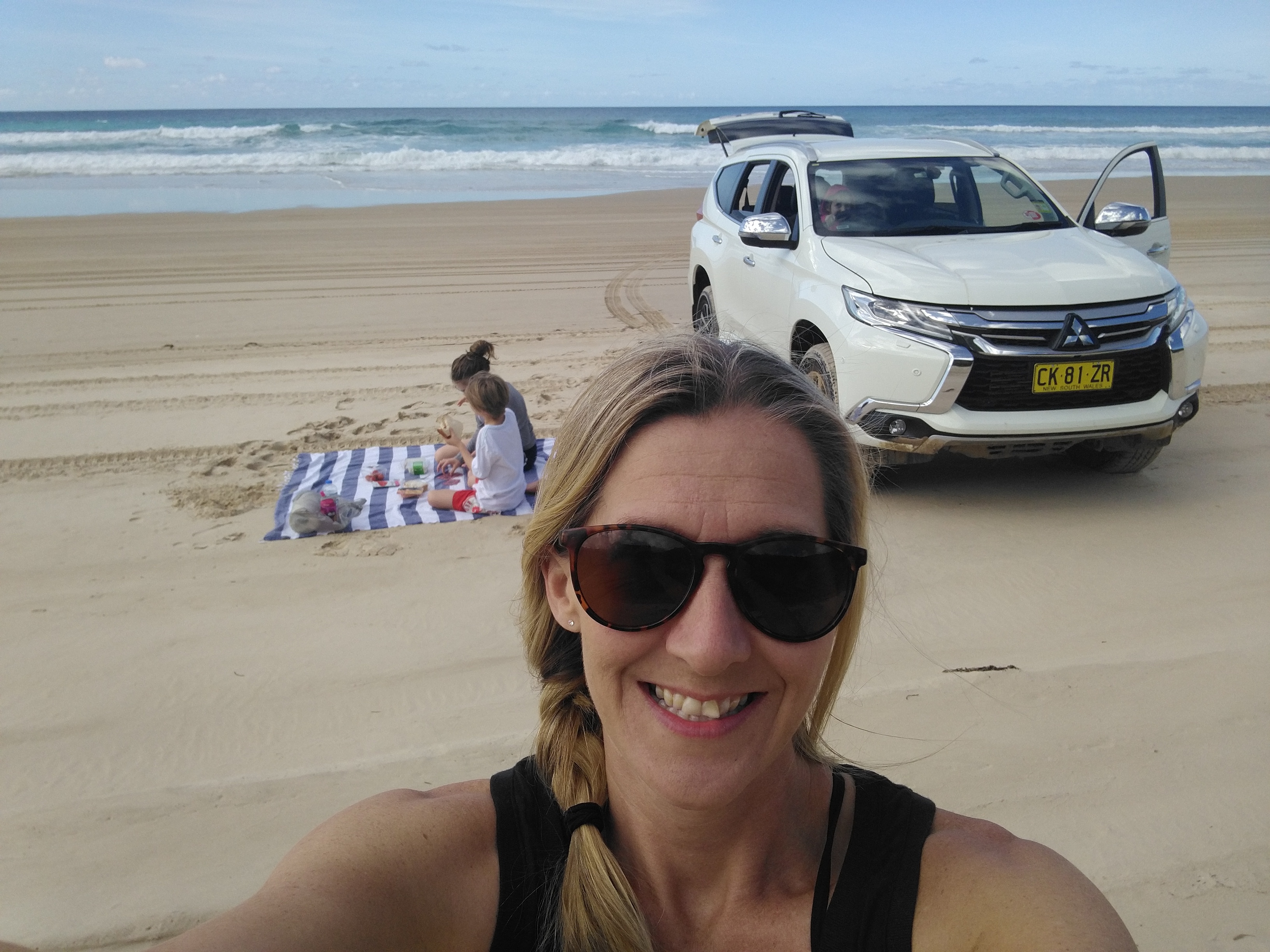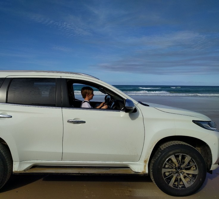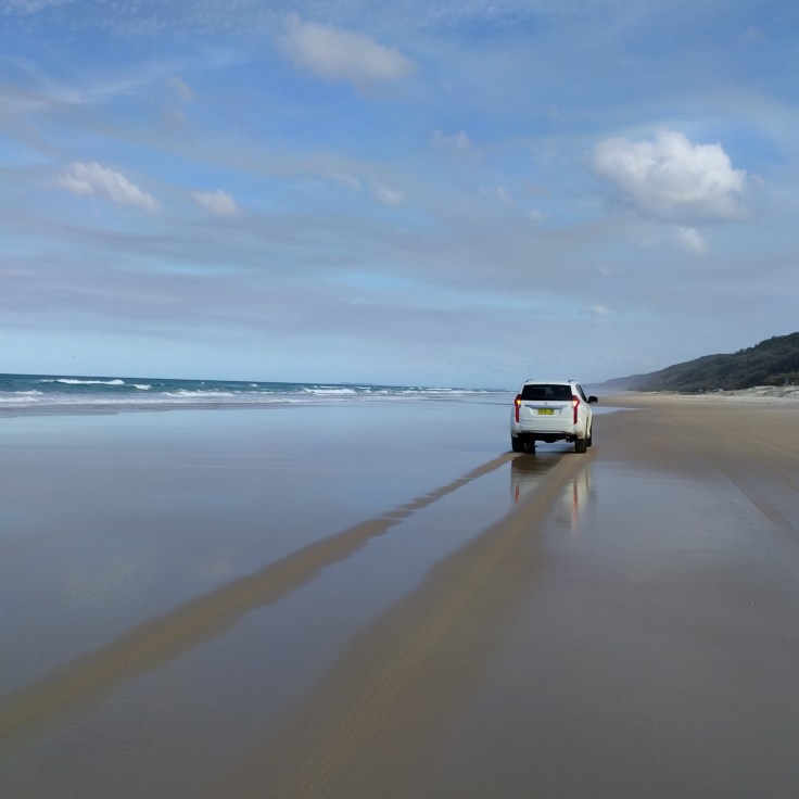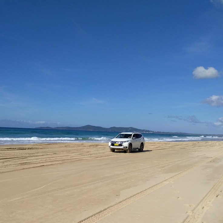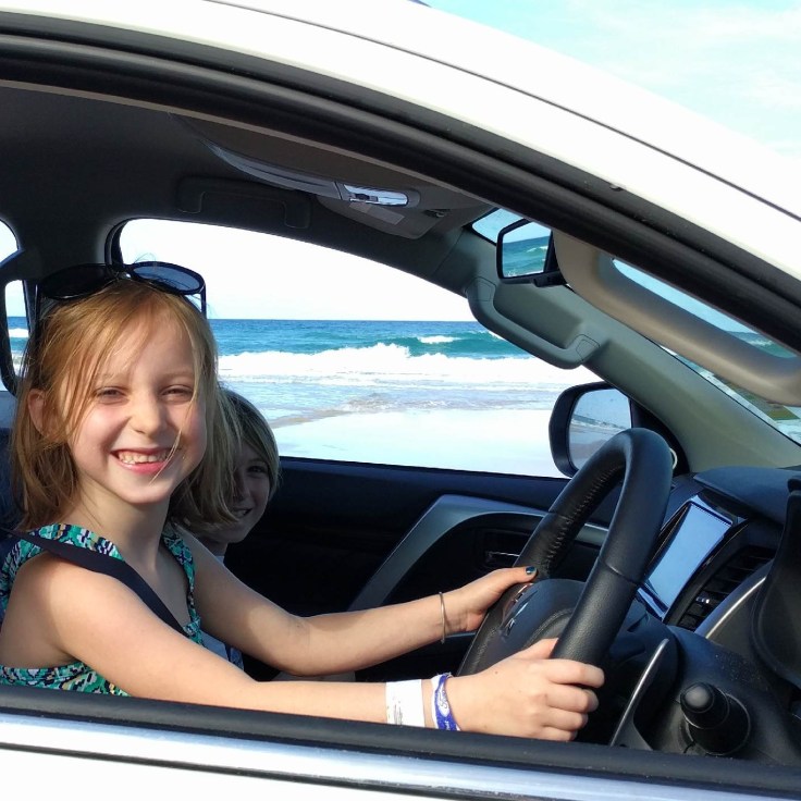 Thursday! Great Beach Drive. We got a 4wd rental car with the hopes we’d be able to check out this highway ON the beach. Literally on the beach. I’ve never driven on a beach before. Wes had been to a beach in Florida where you pull on to the beach to park. But we were both curious about this. We got a permit, packed a lunch, and took off. About 15 minutes from our house was a car ferry to get across the river. Then we drove about 10 min and saw the turn to get ON to the beach. It was incredible. 2 lanes of cars down by the water and you could pull over and stop anywhere. There were speed limit signs. People were also camping in some parts of this beach. We stopped along the way and had a picnic lunch. We had planned to cut over and see Rainbow Beach, but Wes was still very sick and the sand was really deep on the way toward Rainbow. We got stuck once and didn’t want to take any chances, so we headed back home. On the way back home we made a few stops. First, we let each kid drive. They sat on Wes’ lap and the big kids did the pedals. Their frist time driving will be memorable. They discovered red sand and played with that for a while. Then we spotted whales and watched them play.