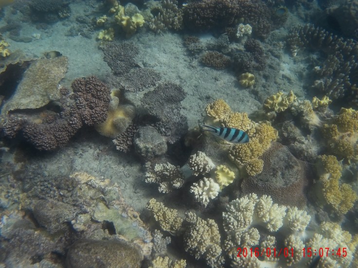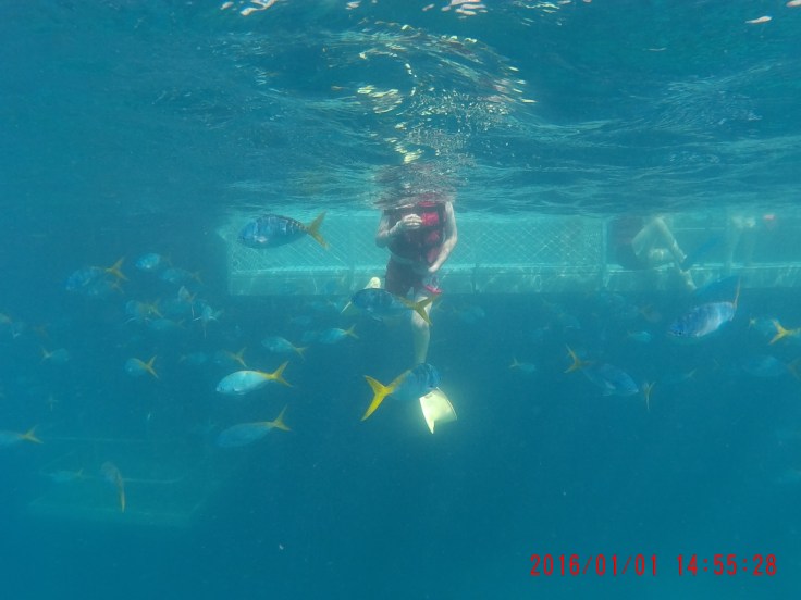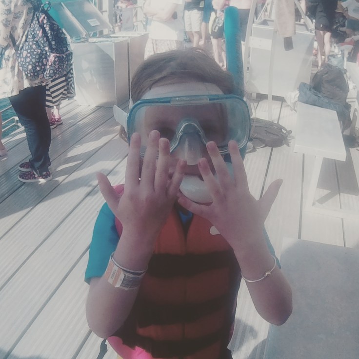 Elle and Wes got into snorkel gear immediately. Little kids decided to do the children’s pool first. I made the mistake in telling Mae that fish won’t go in there. So she and Luke were enjoying themselves. Luke got out. Next thing I know, Mae was screaming bloody murder. I look into the pool and she was alone standing there surrounded by a swarm of fish. Dory fish. It was like slow motion trying to get to her. I was dressed and in flip flops. Someone on the stairs was super slow moving out of my way. People in the water hanging on to the edge of the pool just kept talking and didn’t even try to help her. I finally got to her and scooped her up. She was shaking and yelling, “I was so scared” over and over. It’s a snapshot in my brain. Mae standing in this beautiful clear water surrounded by about 50 colorful, beautiful fish. And her terrified scream. Onlookers thought it was hilarious. It took a bit of time to recover from that. Here are some pics of before and after the “incident” as well as an underwater pic Elle later took of the same fish.