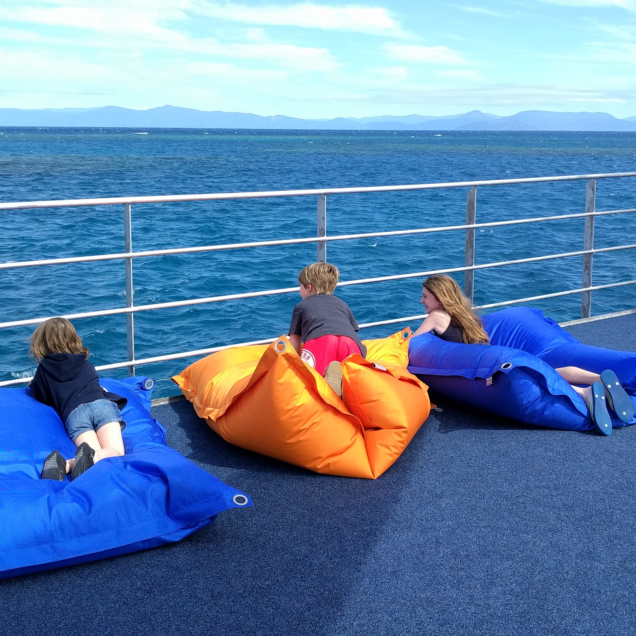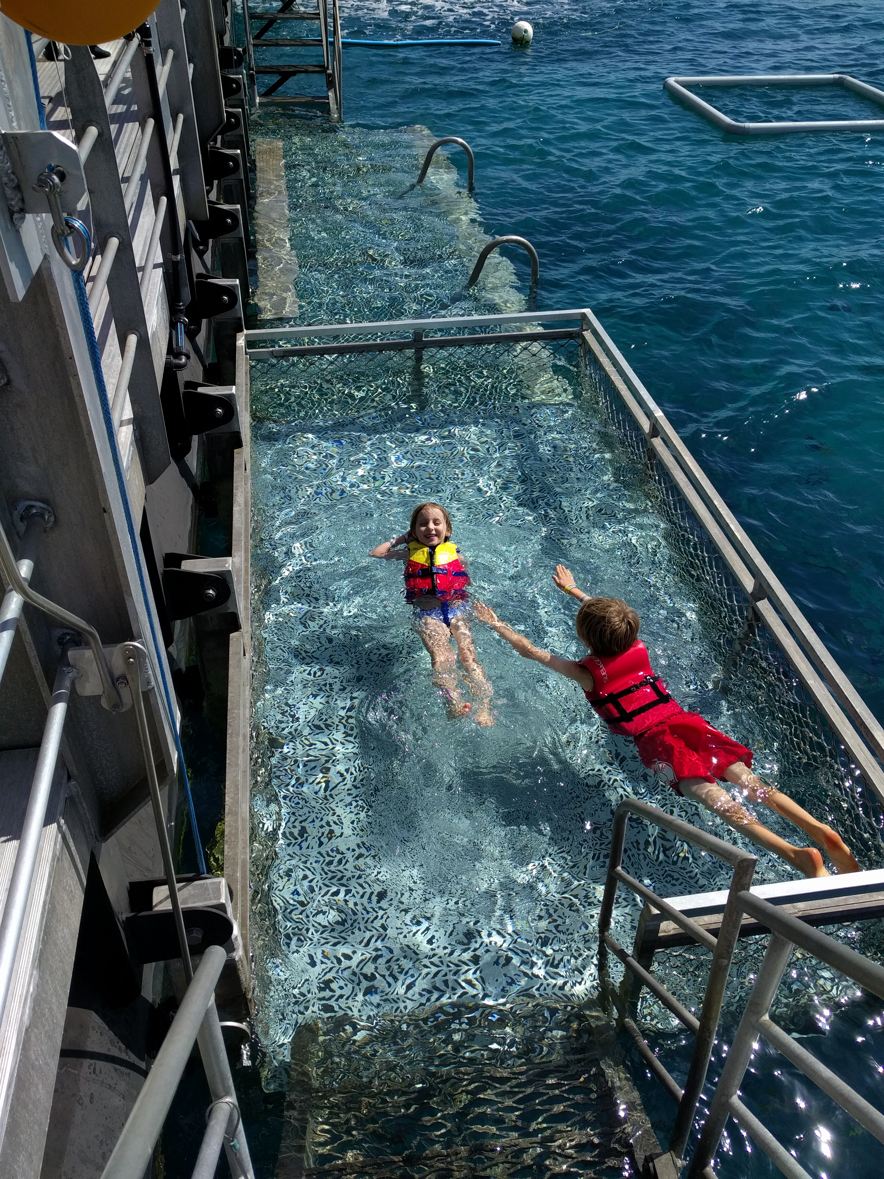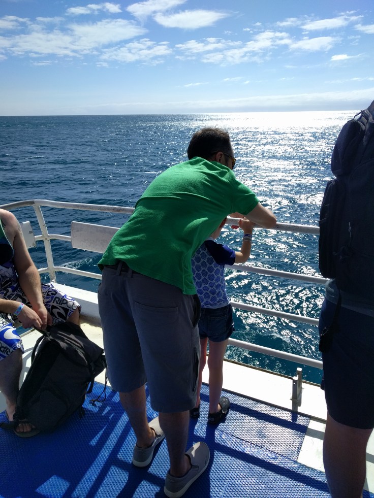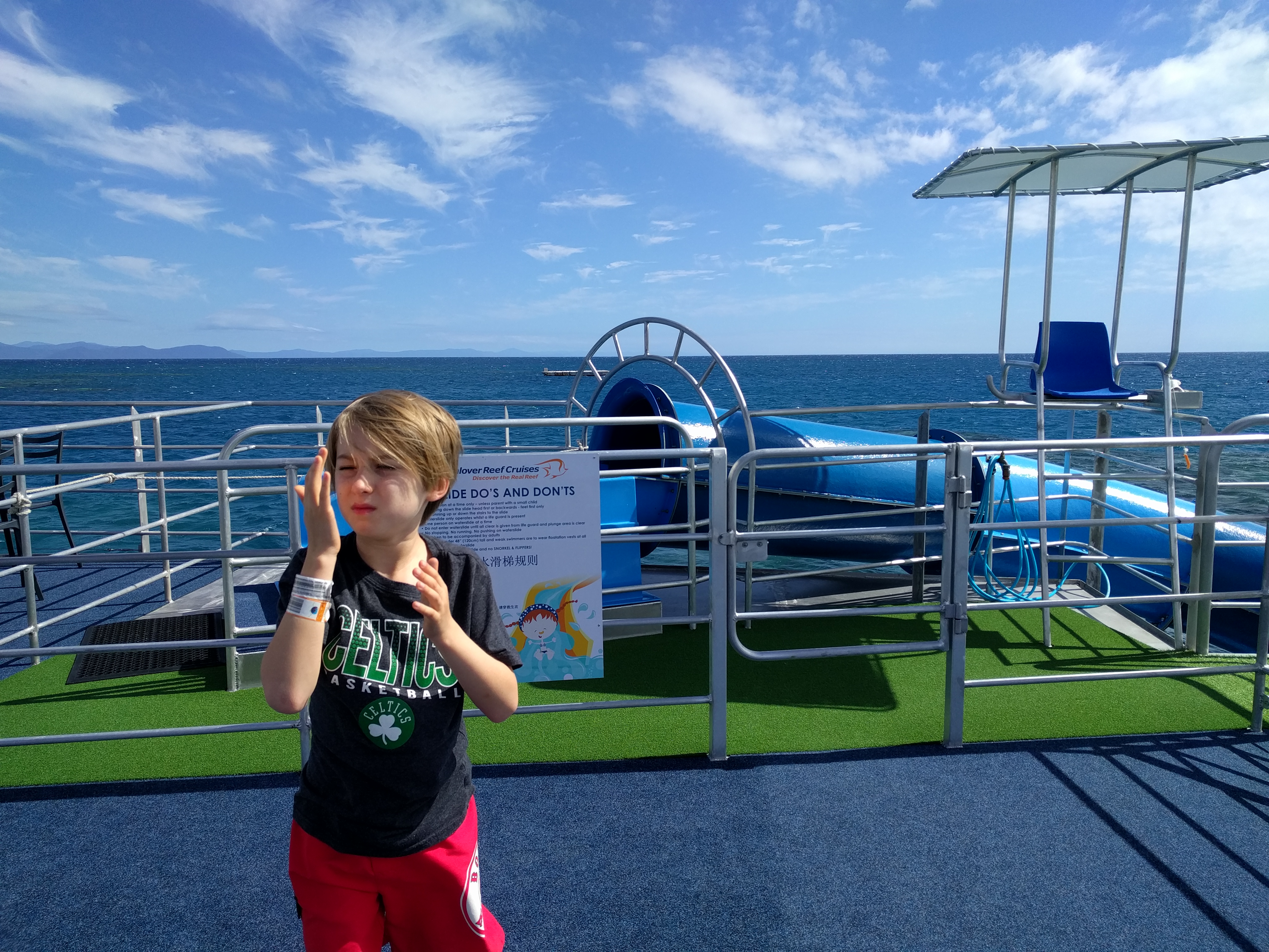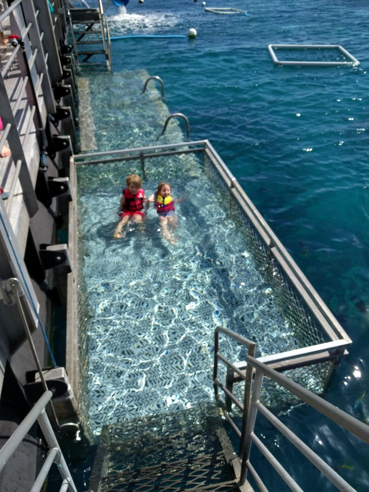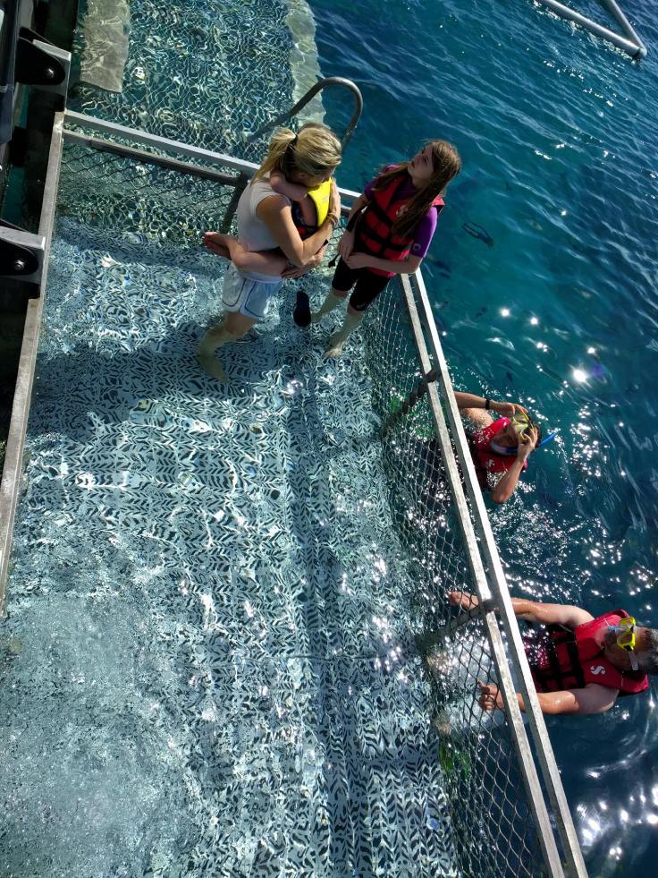 First up, we had a 1.5 boat ride out to the reef. It took a quick pit stop at the beautiful Fitzroy Island to pick up some people. The ride was bumpy. That’s an understatement. It was rough. I won’t go into too much detail, but I will set the scene. Everyone was puking!!! The workers aboard were just running around delivering barf bags to everyone. By everyone…I mean NOT The Marshalls, but 3/4 of the boat. Easily. It was such a tough ride. I saw 3 adults get thrown from their seats onto the floor and they landed hard. It got so bad you really couldn’t walk around at all. Wes and Mae chose to sit outside. Elle decided to join them before it got too bad. One of the workers had to escort her out so she didn’t fall. Luke and I ended up getting stuck inside. We tried to get outside, but we fell onto another seat and just had to stay there. Everyone around us was sick. It was the craziest thing I’ve ever seen. We held strong. Luke had to lie down toward the end. I didn’t know the fate of my outside crew. As we slowed down and approached the pontoon, we could finally move around and reunite. So happy we didn’t get sick and felt fine. Phew.
