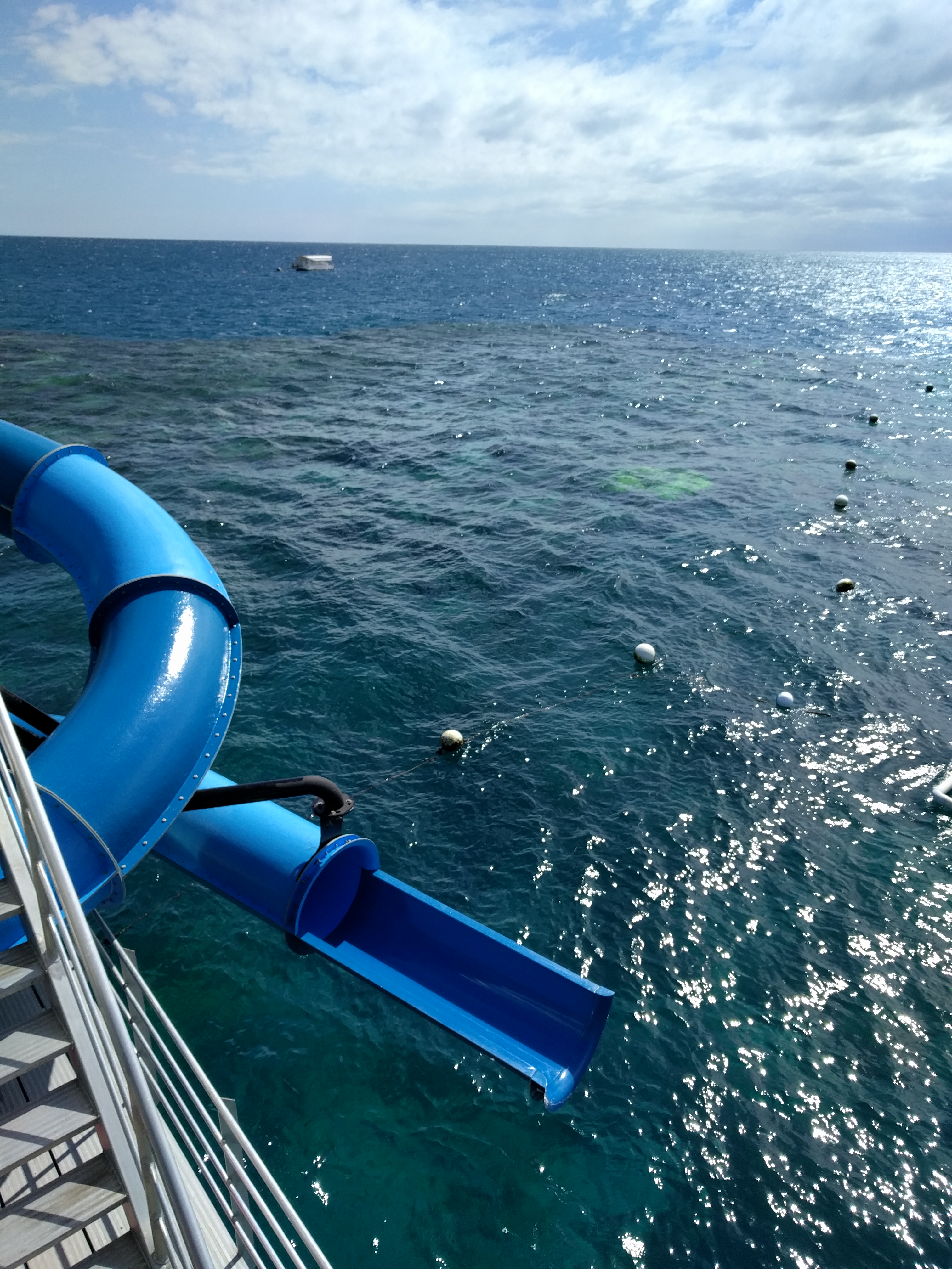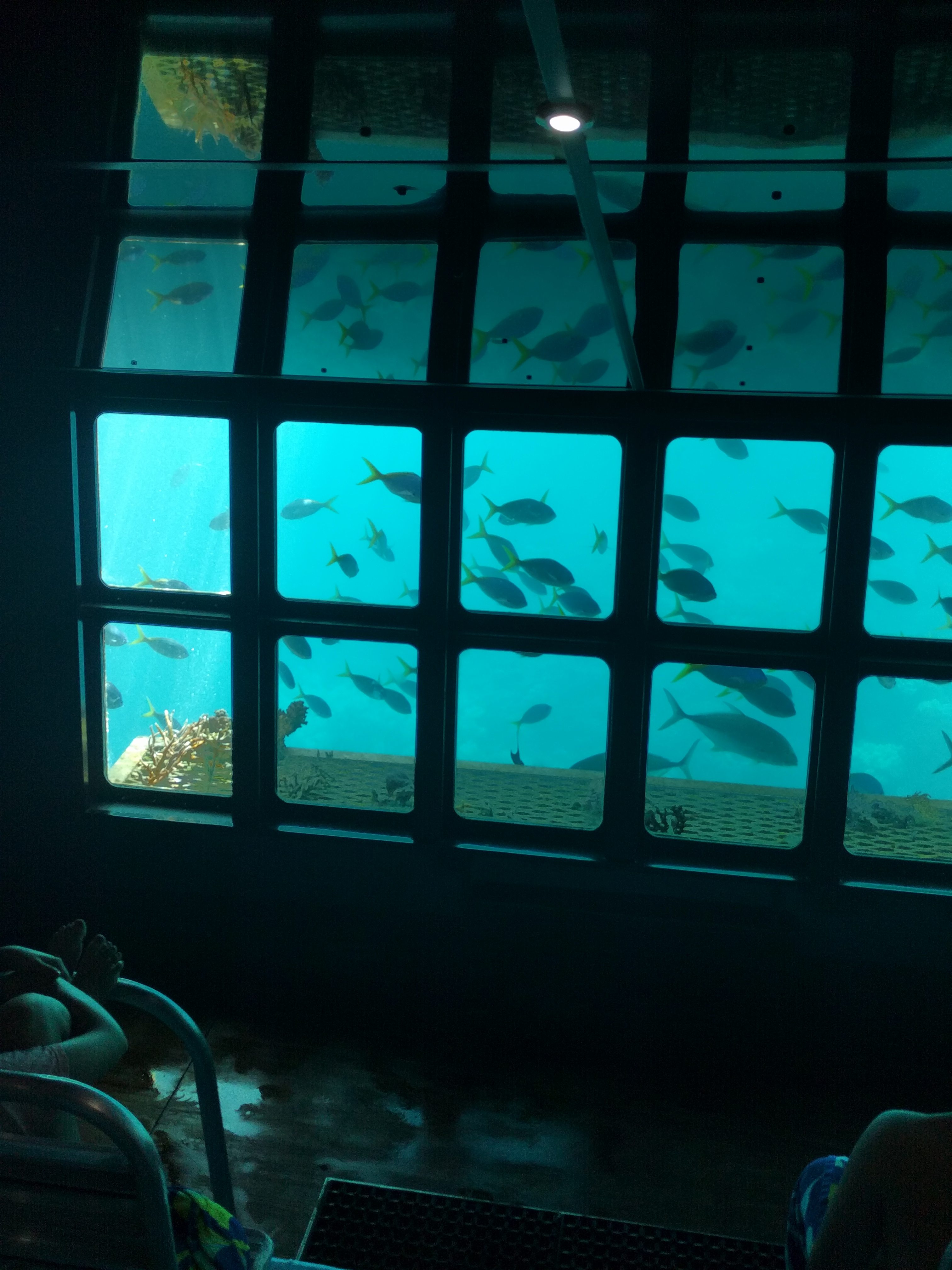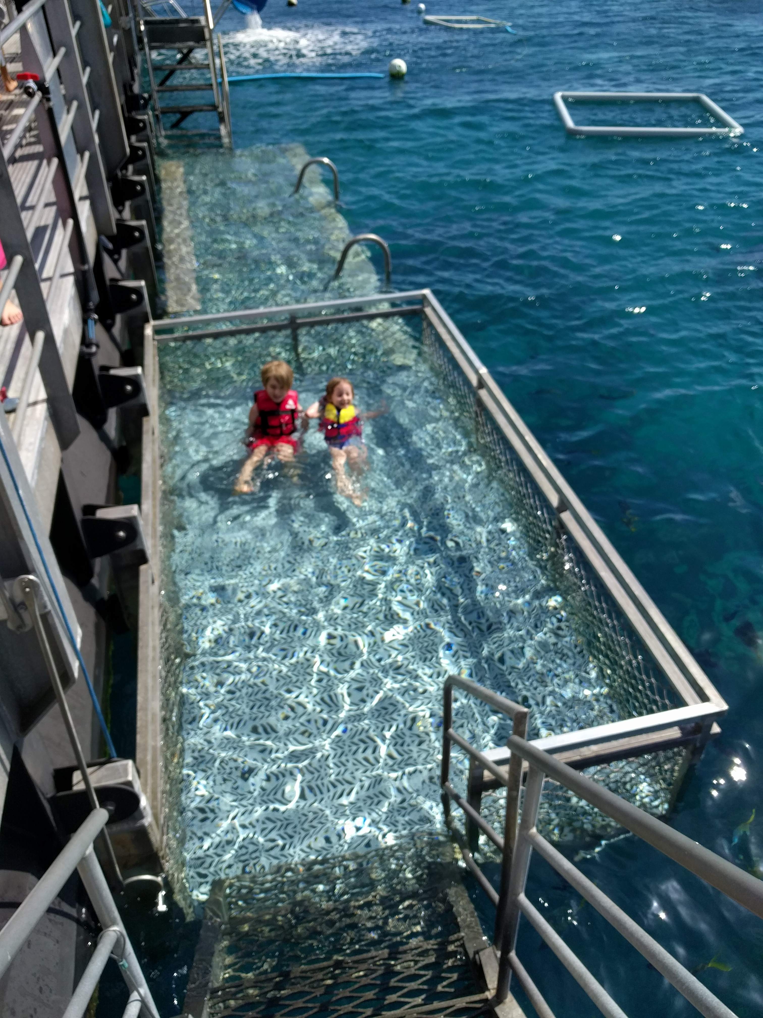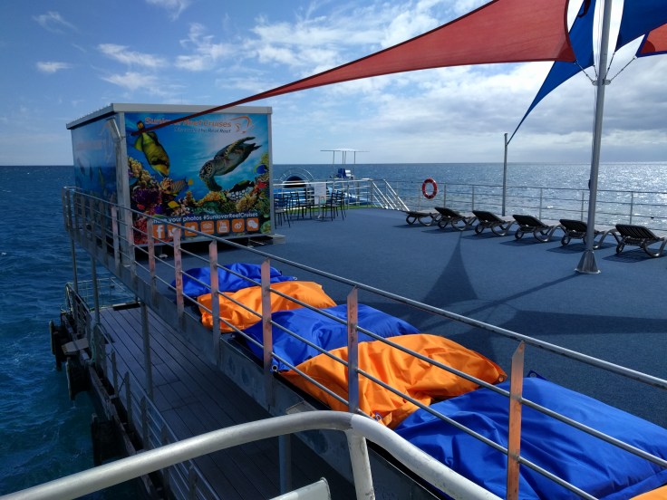 The Pontoon! The boat docked at this pontoon for the day. The pontoon is right in the outer reef. It was something! It had a roof deck with bean bags and lounge chairs and that’s where you could hop on the water slide. There was a children’s pool and an underwater viewing area. From the pontoon, you could take 20 min boat rides on a glass bottom or a semi submerged vessel to get a looksie of the reef. The main level had lots of tables for you to set up your stuff but we used ours as HQ! And that area was where you got all your gear. My kids were excited about the flippers. The pontoon was really cool!