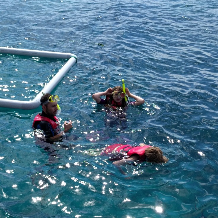 I was anxious to get in the water at this point and not interested in eating after that boat ride. So Elle and I suited up and jumped in. I snorkeled for about 5 minutes on our honeymoon and didn’t like being so close to fish. I knew I couldn’t do that here. This was the Great Barrier Reef and I had to model bravery for the kids and take advantage of this opportunity. So Elle and I dove in together. I immediately stuck my head in….and there it was. I wanted to yell or cry or do something. I felt very overwhelmed by what I was seeing. I studied the GBR with the kids in homeschooling and I’ve seen a documentary. Nothing prepared me for what I saw. I can’t explain it. Gliding along the water with my flippers felt so good. Breathing through the snorkel was so easy. And there it was. The infamous reef and fish. Beautiful fish. Their home. We saw a big giant Maori Wrasse. He was so cute and big and swam right along with us. It was so quiet and peaceful. Elle and I looked over and noticed Mae was in snorkel gear!!! Wes, Mae and Luke joined us. Magic! All 5 of us snorkeled together. It was the best. Later, I went down the slide and we tried the semi sub (boring!) Wes and I each took a turn snorkeling alone when the kids were done. I want to do it again. I feel like we were just warming up. 4 hours on the pontoon flew by! It was worth the money and the boat ride. I’m so happy the kids had this experience. They will never forget. They all want to snorkel again… especially Luke (still shocked by this!) However, their first snorkel will be very hard to beat! What a day!