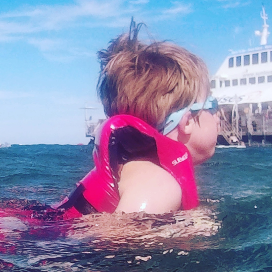 Snorkeling! Elle and Wes were in their wet suits, snorkle gear and life vests. Luke decided just to take a dip in and take a peek. He was originally worried about sharks, but they told him they wish they were lucky enough to see one. Very rare. The other thing he didn’t like was having his nose covered. I had brought along his goggles so he snorkled without a snorkle. He did it his way. But he did it. He had zero interest in trying and the next thing I knew, he was in there yelling, “This is so cool!” I hung back with Mae for a bit. They used Elle’s underwater camera (her Christmas gift) and came out eventually to have some lunch. Elle decided to try the slide. She loved it. It was dark and fast. She took video going down the slide with her camera. Super cool. Mae went down on Wes’ lap.