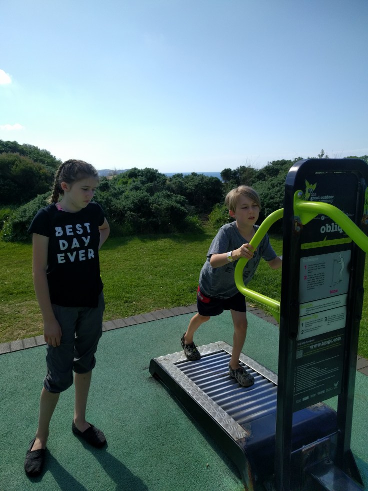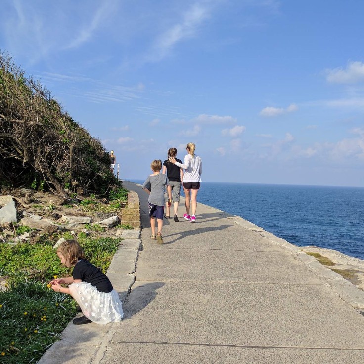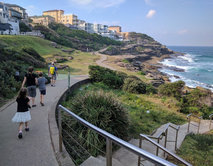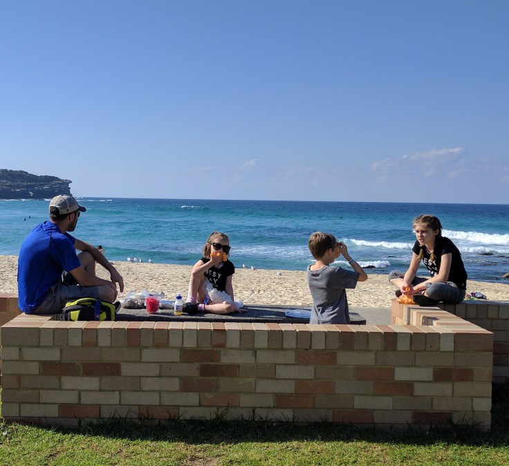 After leaving Bronte… we walked over to Tamarama. This next set of pics is from the walk to Tamarama and of our stop there. We didn’t plan to stop. Tamarama is a small beach, also known as Glamarama. I read up on our walk before we left, and it was called this because it’s where all the “good looking” people hang out. My kids found this funny, and we joked about it. Clearly, that is why we had to stop here. No, actually, it was because there was another playground! Wes and I were hungry so we shared a salmon bruschetta from the beach kiosk and sat at a table near the beach while the kids had popsicles on the playground. The kids began to play an imagination game of “Animals”, which was Mae and Luke’s favorite part of the whole day. Their game continued for a bit more after we left Tamarama. Mae was a kitty. Luke was a puppy. Elle was the owner. Something cute like that. I had to include a pic of them at this playground since 2/3 of them declared it their best part of the walk. They played nicely, and it allowed Wes and I time to sit quietly for a few minutes.  Then we carried on to our final stretch!  So close.