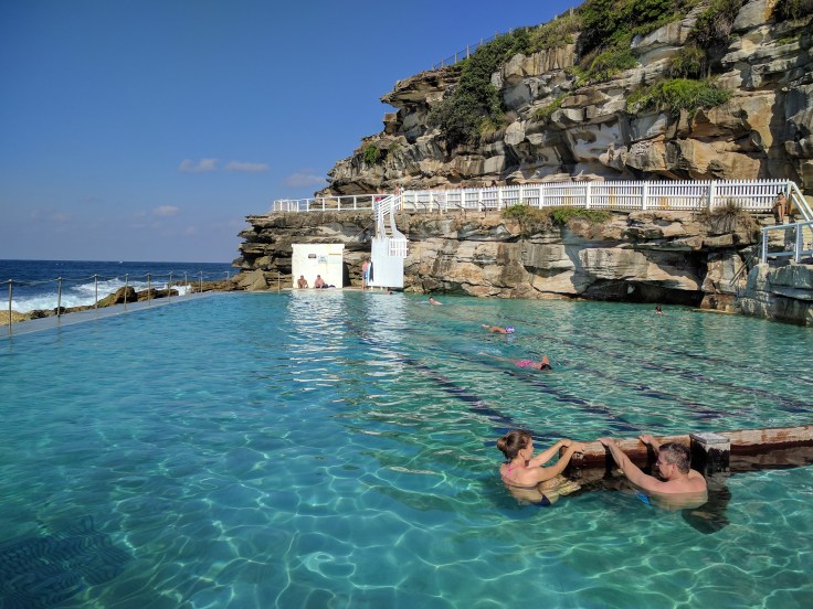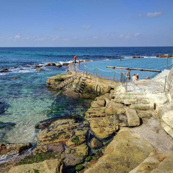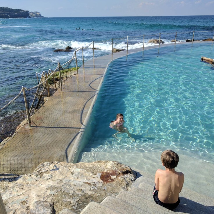 Onward. Next we arrived at Bronte Beach where we stayed for a while. First, we unpacked all our snacks and had a little lunch by the beach. Wes popped up to see the town as he does. We watched surfers for a while. The waves were huge! I told the family I wanted to take a quick peek at the ocean pool, and they all came along. Good thing. We had no idea it was so nice. The kids hopped in right away. It was cold, but felt like a real pool. Then an orange rolled out of our bag and down the rocks and plooped into the water. There is a pic below of us all trying to rescue​ it. What a funny memory. Glad Wes snapped a pic. Another man was watching the whole thing. How silly we must have looked. That’s us… silly Marshalls trying to save an orange from the ocean. We succeeded, by the way. It was a lovely break at Bronte. We must have been there for at least an hour. Next up… on to Tamarama!