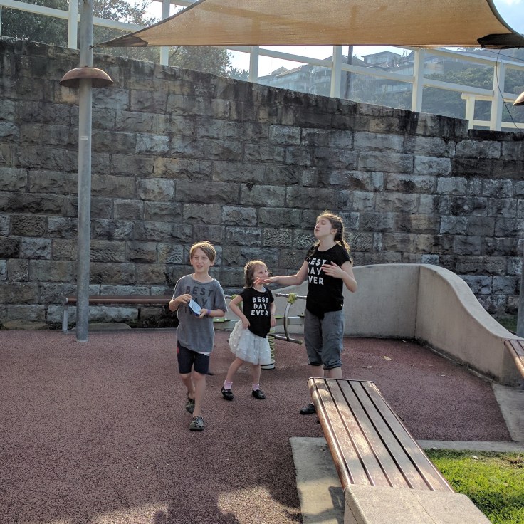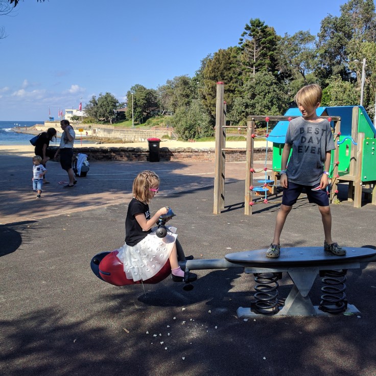 Then we arrived at Clovelly.  Kids beelined for the tiny playground, and we pulled out some snacks. The area on either side of the beach are nicer than the actual beach. The kids walked right past the ocean pool, which is unusual. They were just happy to see a playground. Kids are the best. Typically, I have to drag them to the playground near our house, but after all that sightseeing, they just wanted to play!