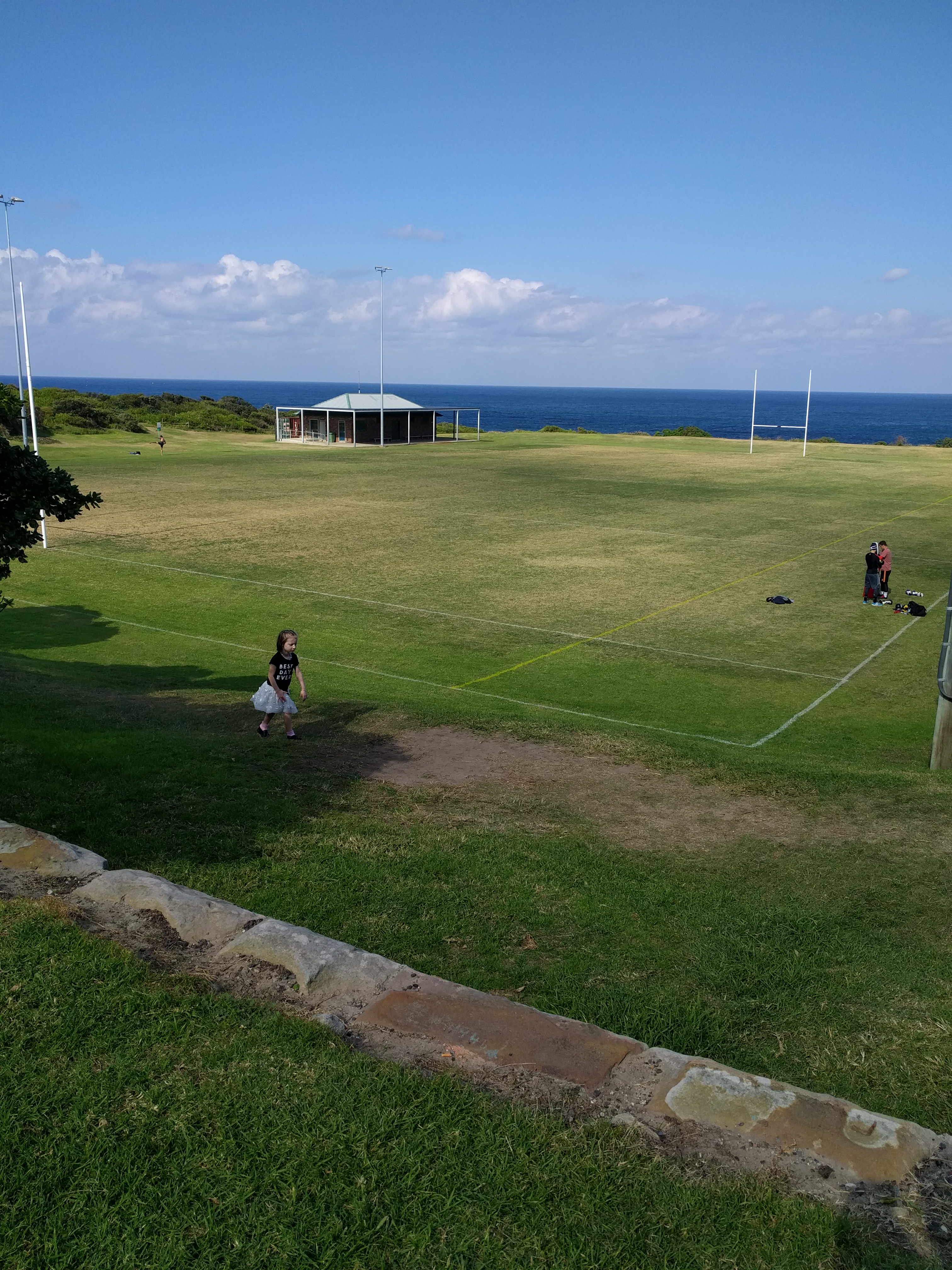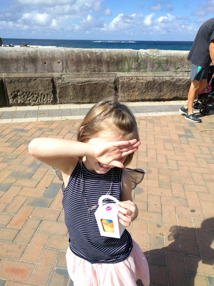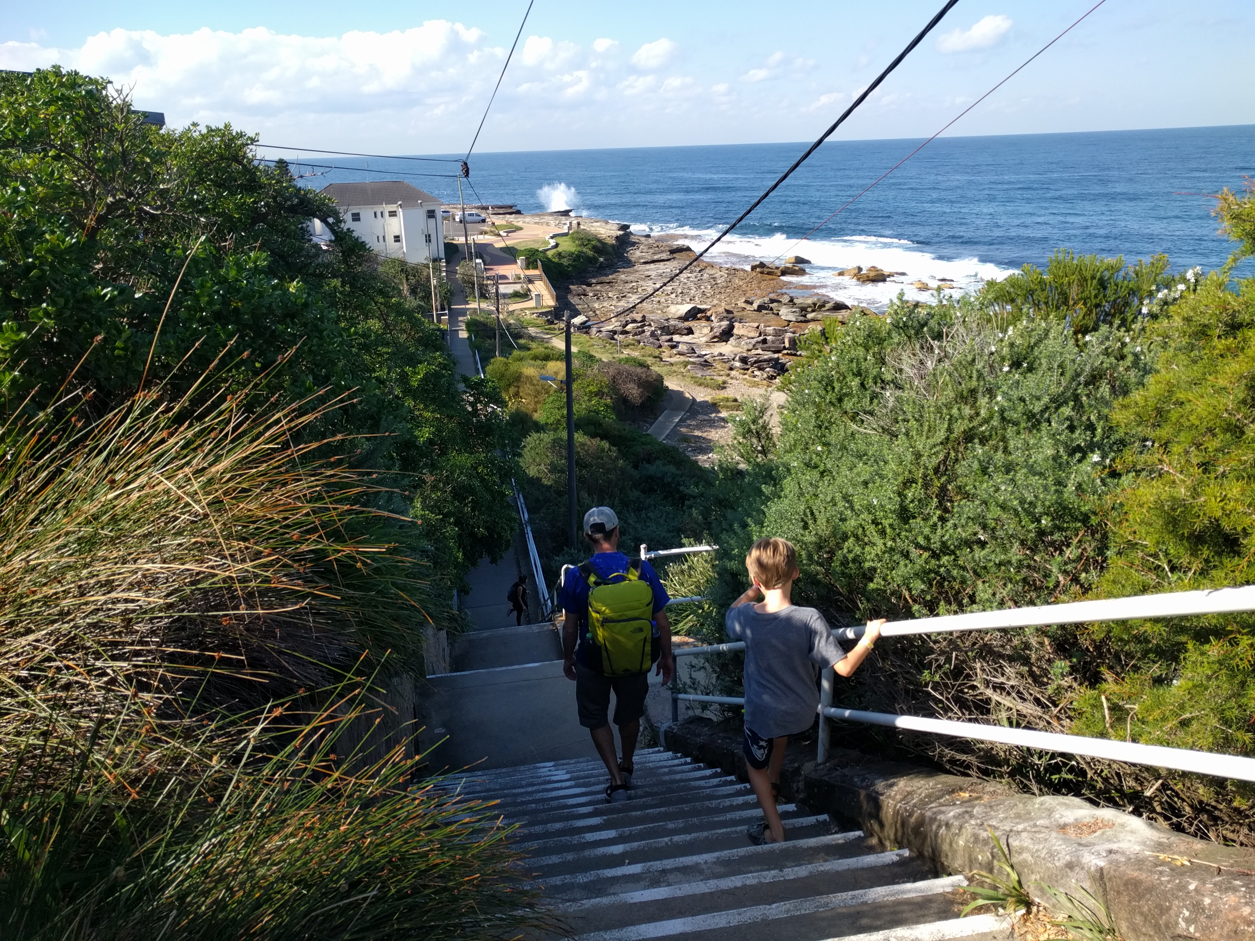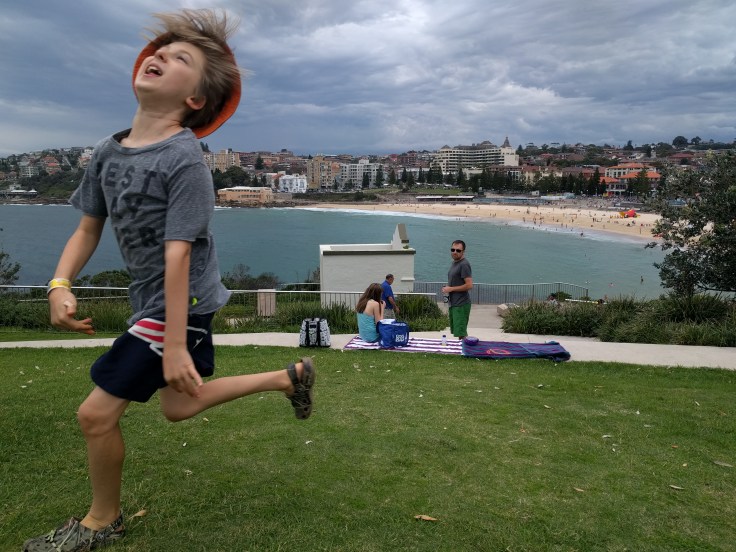 After leaving Bronte… we walked over to Tamarama. This next set of pics is from the walk to Tamarama and of our stop there. We didn’t plan to stop. Tamarama is a small beach, also known as Glamarama. I read up on our walk before we left, and it was called this because it’s where all the “good looking” people hang out. My kids found this funny, and we joked about it. Clearly, that is why we had to stop here. No, actually, it was because there was another playground! Wes and I were hungry so we shared a salmon bruschetta from the beach kiosk and sat at a table near the beach while the kids had popsicles on the playground. The kids began to play an imagination game of “Animals”, which was Mae and Luke’s favorite part of the whole day. Their game continued for a bit more after we left Tamarama. Mae was a kitty. Luke was a puppy. Elle was the owner. Something cute like that. I had to include a pic of them at this playground since 2/3 of them declared it their best part of the walk. They played nicely, and it allowed Wes and I time to sit quietly for a few minutes.  Then we carried on to our final stretch!  So close.