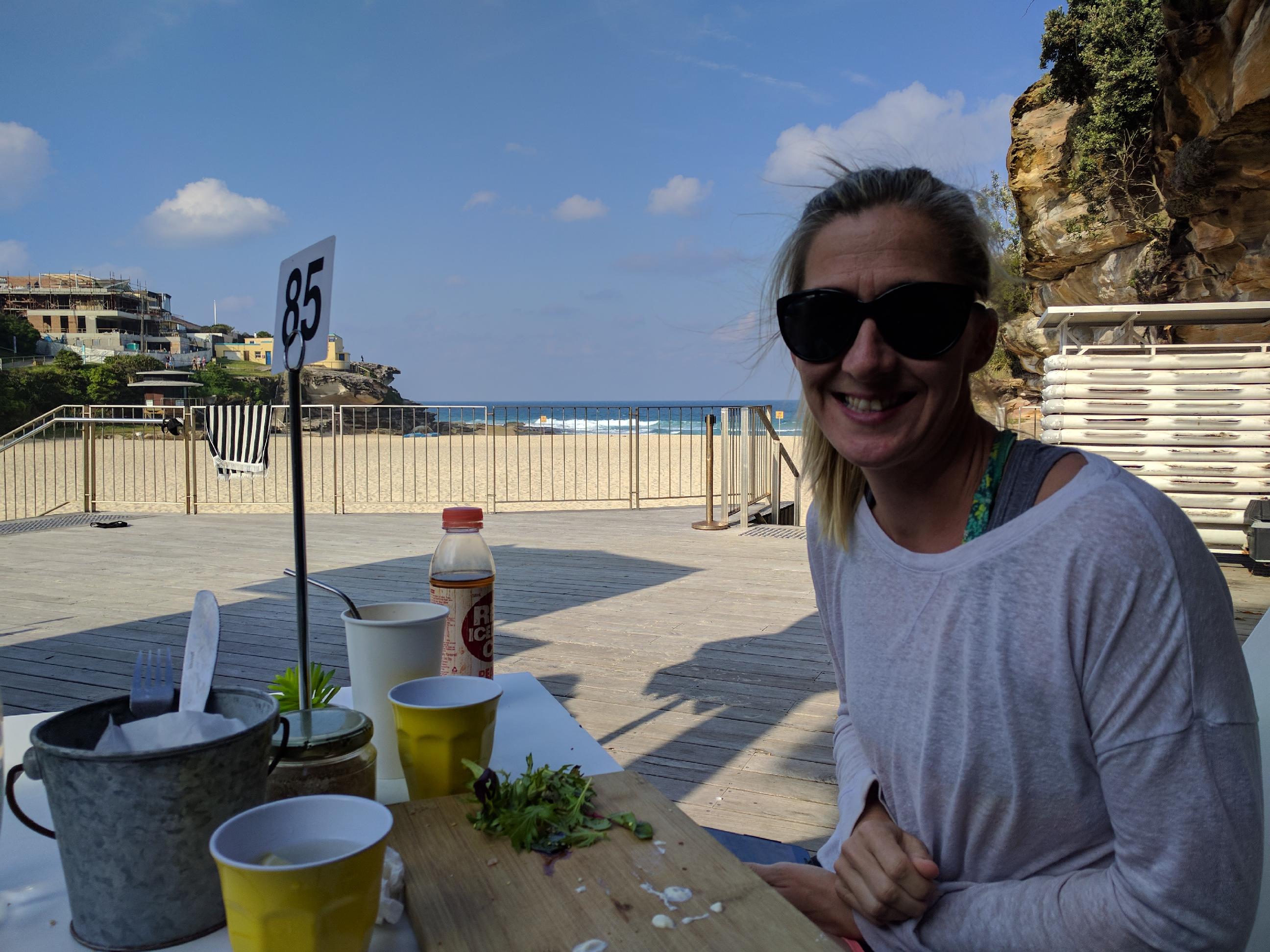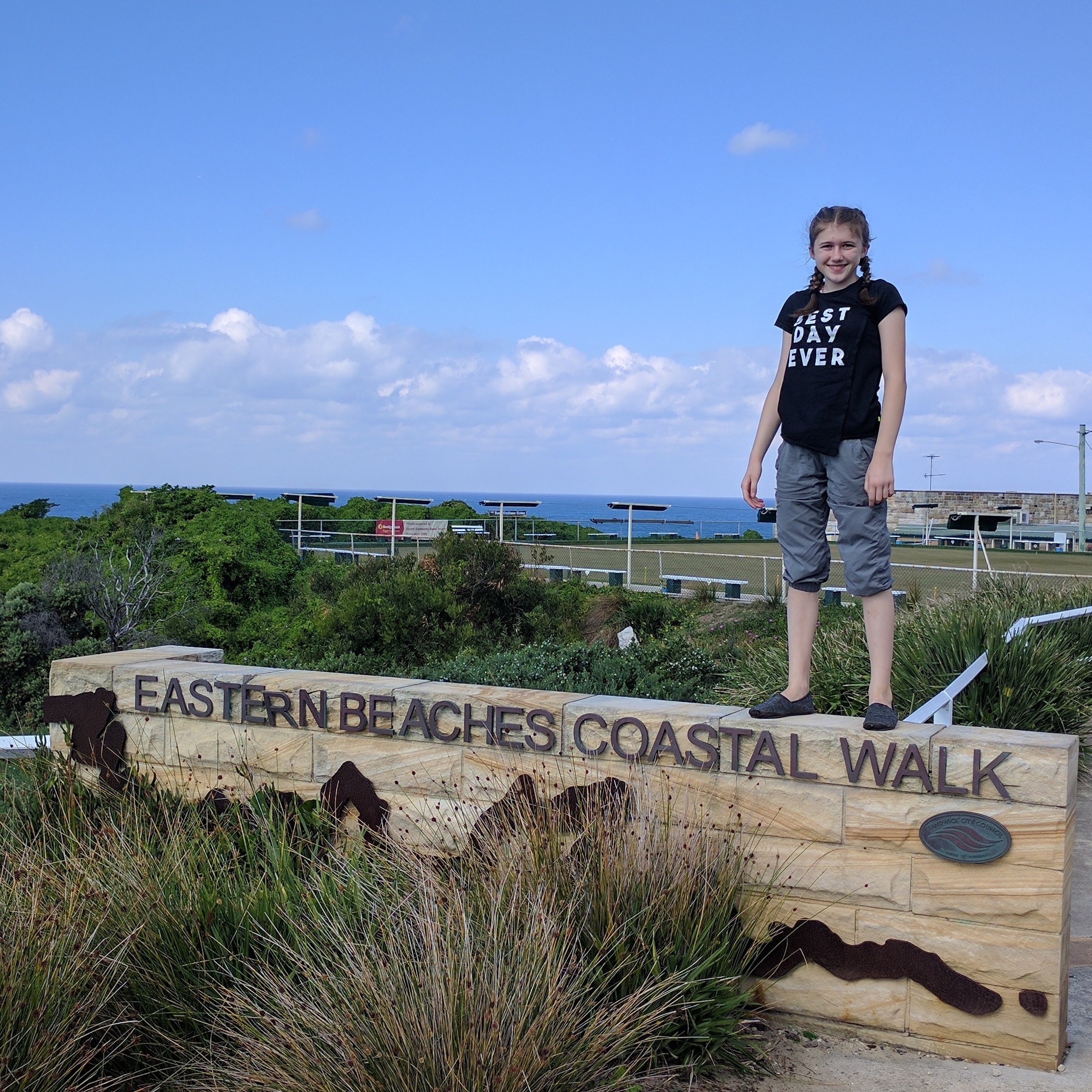 May 11, 2017: Here we go! Weather forecast was just right. About 70 degrees and mostly sunny. We chose to go on a weekday hoping there would be less people. We left right after breakfast. First stop…coffee for mom. First tumble…Mae Mae fell before we even made it a block down the street. It was all good. As I mentioned, most people walk Bondi to Coogee. Since we live in Coogee, we decided to start here, walk to Bondi and take the bus home. Off we went. We decided to take a “start” and “finish” selfie, and a nice lady offered to take our “start” pic for us!