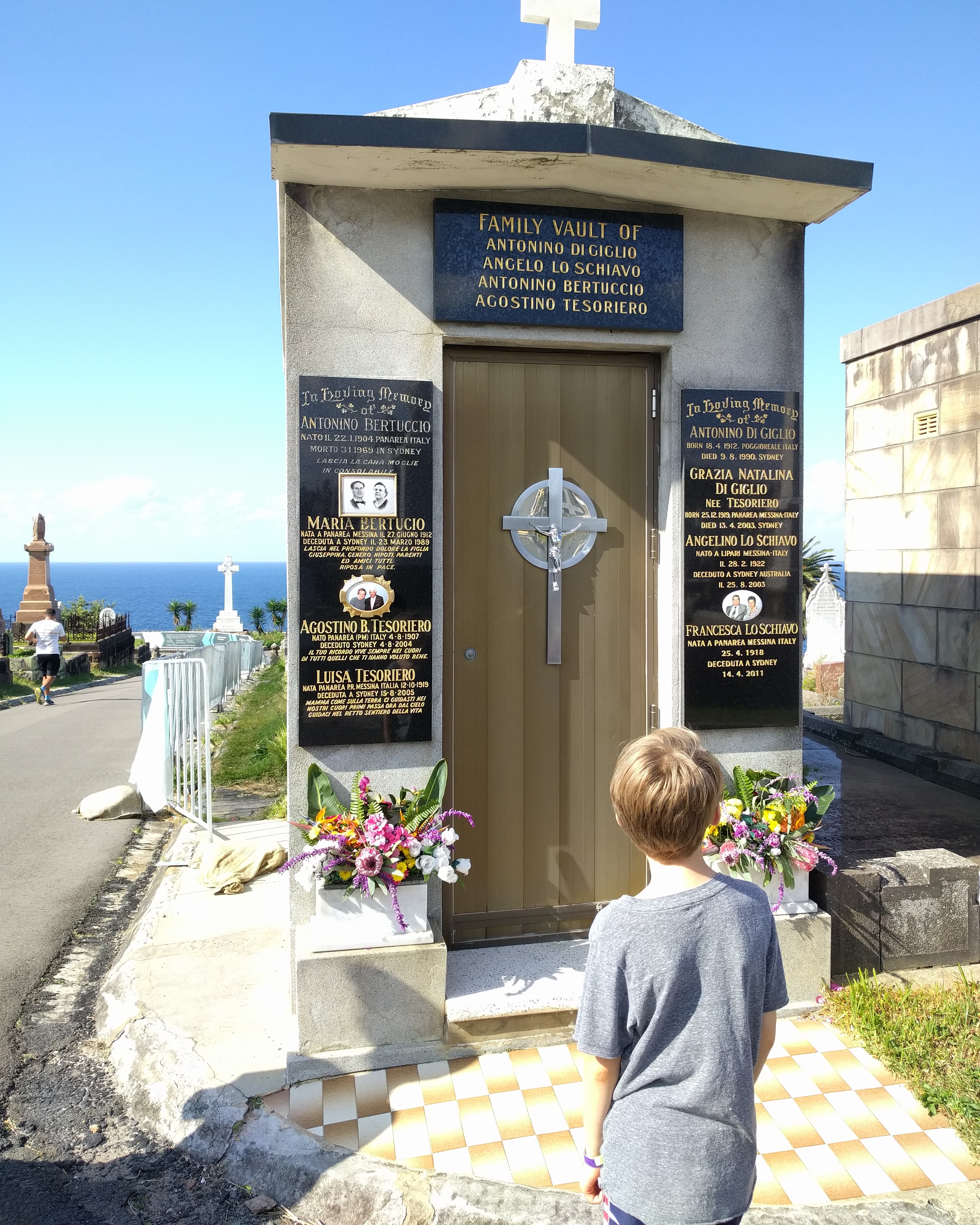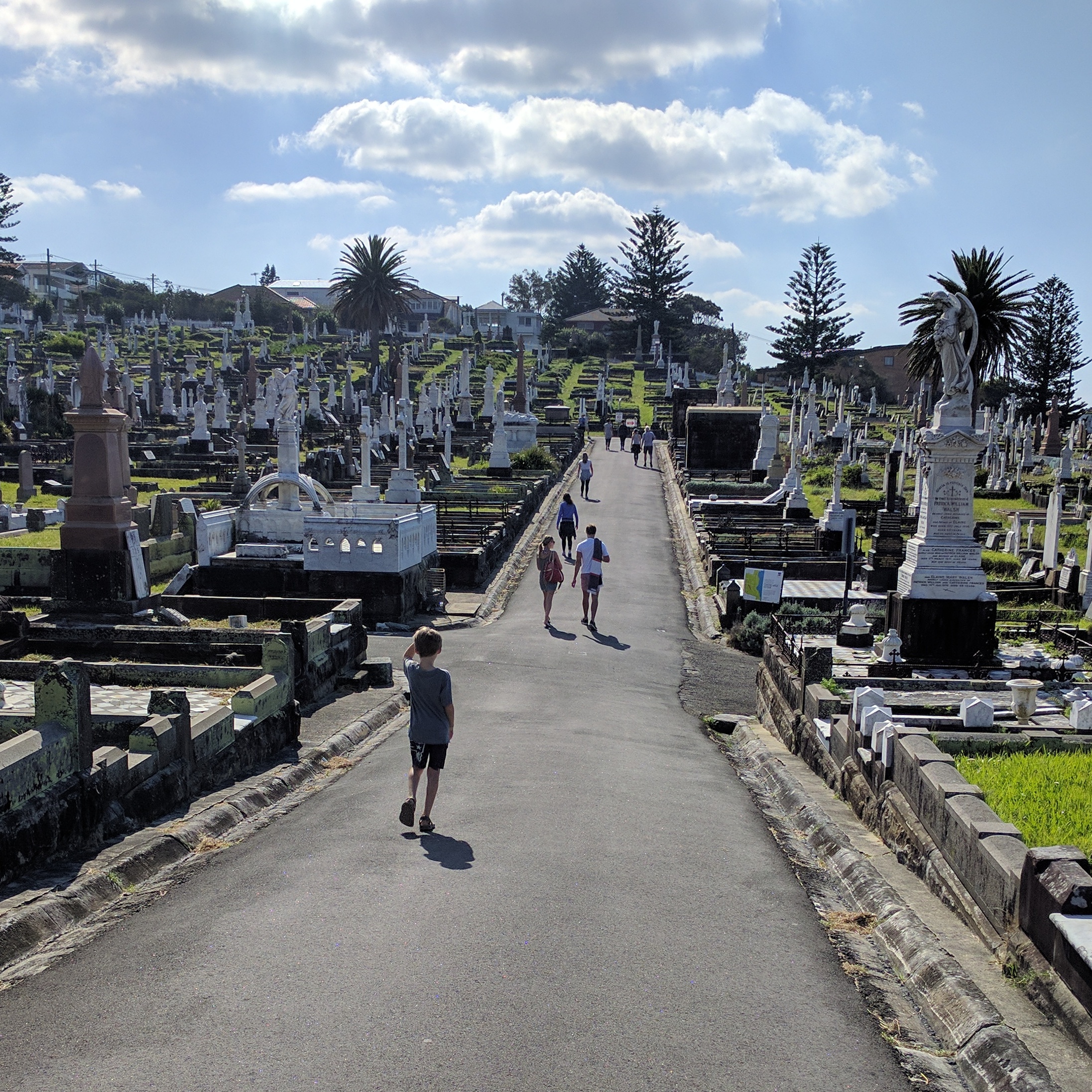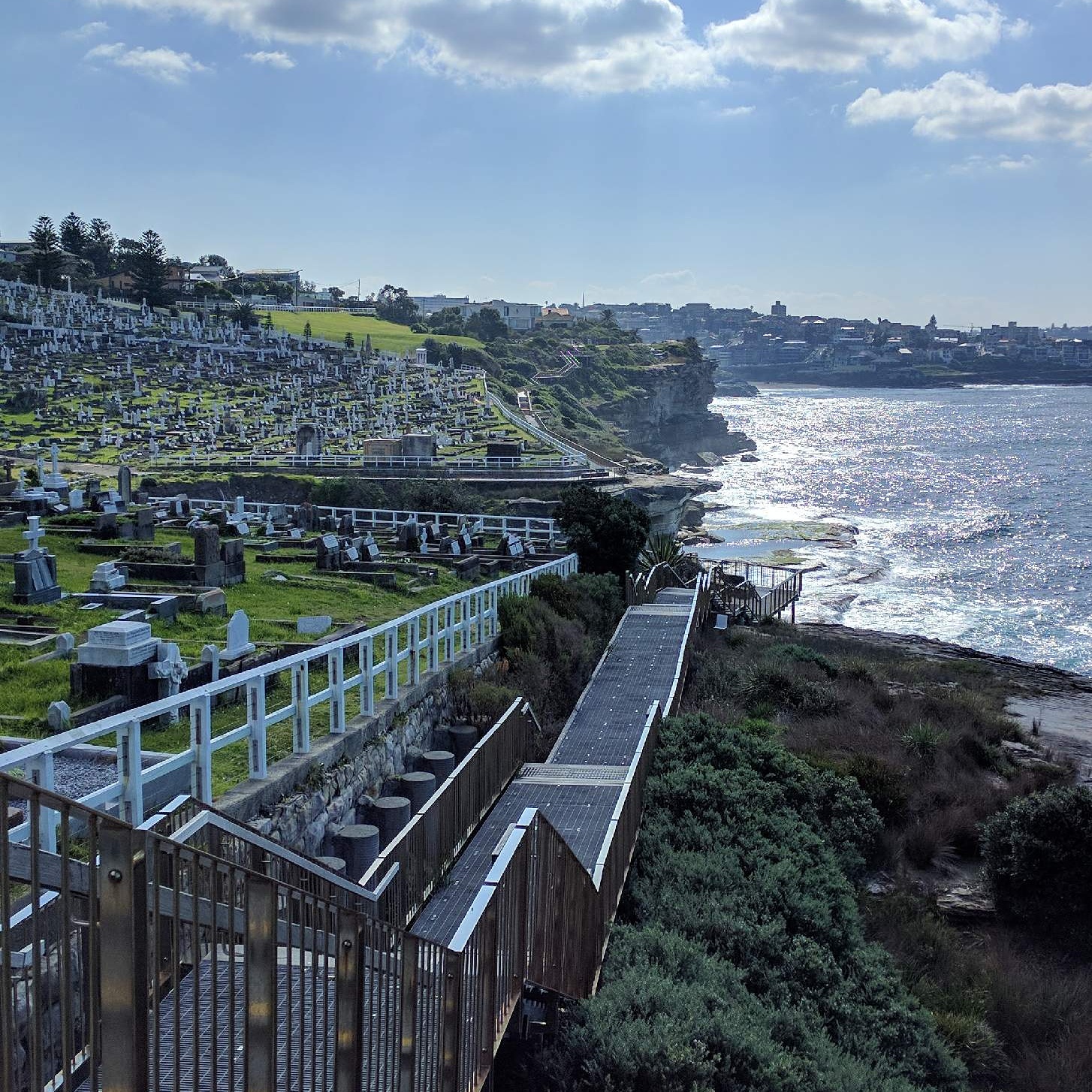 We arrived at the most amazing cemetery I’ve ever seen. Hard to even really show in pics. Unfortunately, this part of the coastal walk (a boardwalk that extends over water) was damaged in a storm last year, so we had to take a detour through the cemetery. Walking through​ it was fascinating. We got to check out some gravesites and have some interesting conversations. Like I said, it was hard to capture the size and beauty of this place. Google ‘Wavery Cemetery’ in Sydney and maybe you’ll be able to see it better. While you’re at it, buy yourself a plot because we should all rest in peace here together.