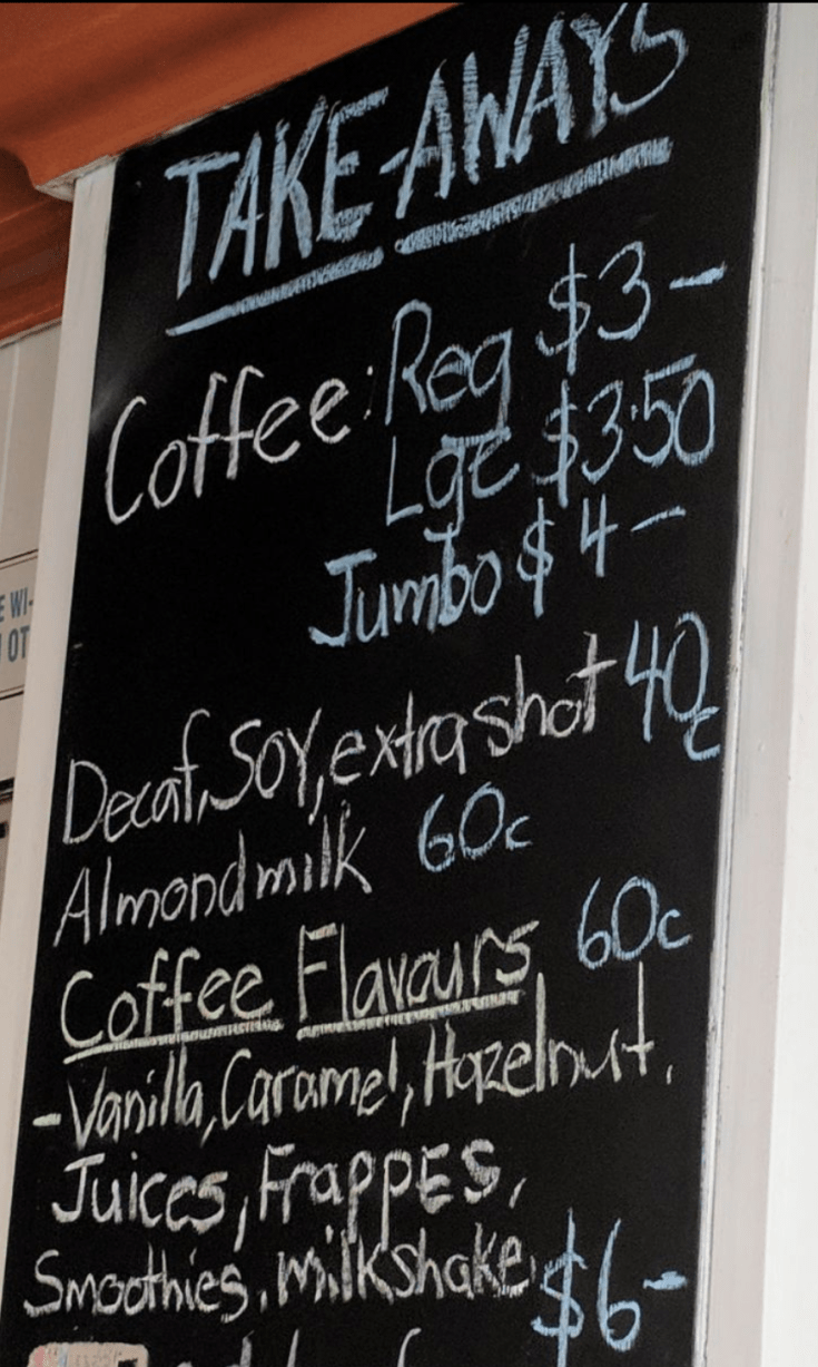 3. Price- Coffee typically comes in one regular size. I’d liken it to a Starbucks tall. Usually, at most cafes, no matter what you order, a regular is one price. Then you can pay a bit more (around 50¢) for a large or other things like decaf or soy or maybe a flavor, but flavors don’t seem too common. This confused the heck out of me. It was so simple yet so complicated. Check out the menus below and see for yourself. There’s obviously some variety in pricing from cafe to cafe. I’ve seen places charge less for an americano and more for a mocha. A regular is typically around $3.00-4.00 and a large would usually be an extra 50¢…give or take. Again, I am NO expert. This is my anecdotal evidence of coffee culture. Have I mentioned it’s ALL delicious?  When thinking about prices keep in mind, this is AUS currency.  $4.00 in Australia currency (AUD)  is about $2.96 In US dollars (USD.) And also the size of the cup has to be considered, too, when making the comparison. It’s very odd, still, that I bring 2 tiny gold coins to buy a coffee. I’ve probably never paid for a coffee in America with coins! Definitely not with just 2 coins anyway.